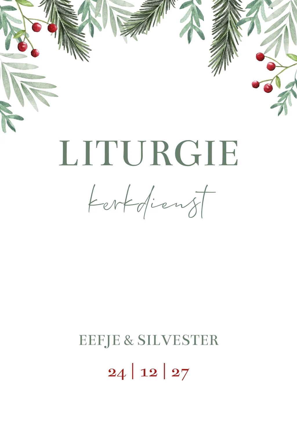 Maak een liturgie boekje voor de trouwdienst of ceremonie van jullie bruiloft. Dit ontwerp is onderdeel van de trouwhuisstijl Christmas Love. De liturgie heeft 8 pagina's en wordt gedrukt op mooi 170 grams papier. Het boekje wordt samengebonden met 2 nietjes. Folie is niet mogelijk.