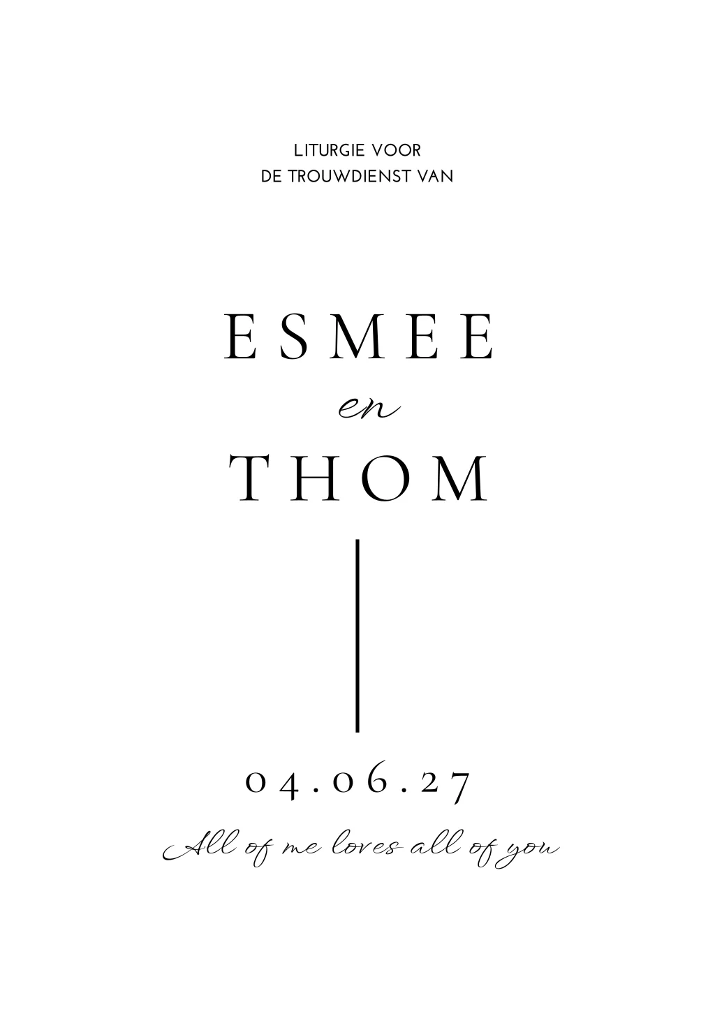 Een liturgie boekje voor de kerkdienst of ceremonie van jullie bruiloft. Dit klassieke ontwerp heeft een witte achtergrond met zwarte letters en is onderdeel van een trouwhuisstijl. Pas de teksten zelf aan in de editor. De liturgie heeft 8 pagina's en wordt gedrukt op mooi 170 grams papier. Het boekje wordt samengebonden met 2 nietjes.