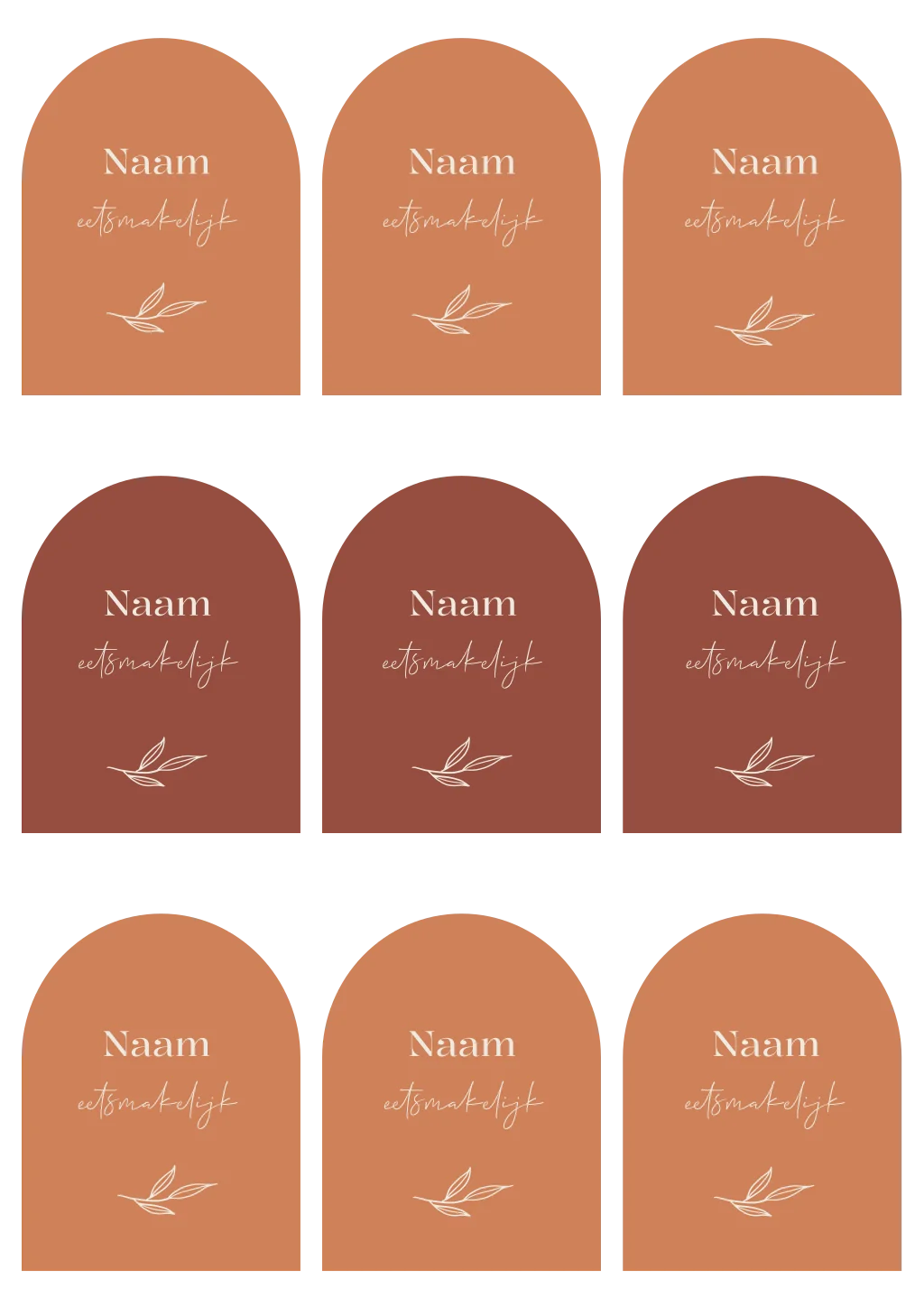 Unieke naamkaartjes in boogvorm voor bij het diner van jullie bruiloft in de kleuren oranje en rood. De naamkaartjes hebben een boogvorm formaat van 6,5x8 cm en zijn enkelzijdig bedrukt. Er zitten 9 stuks op 1 vel die je tegelijk kunt bewerken in de editor.