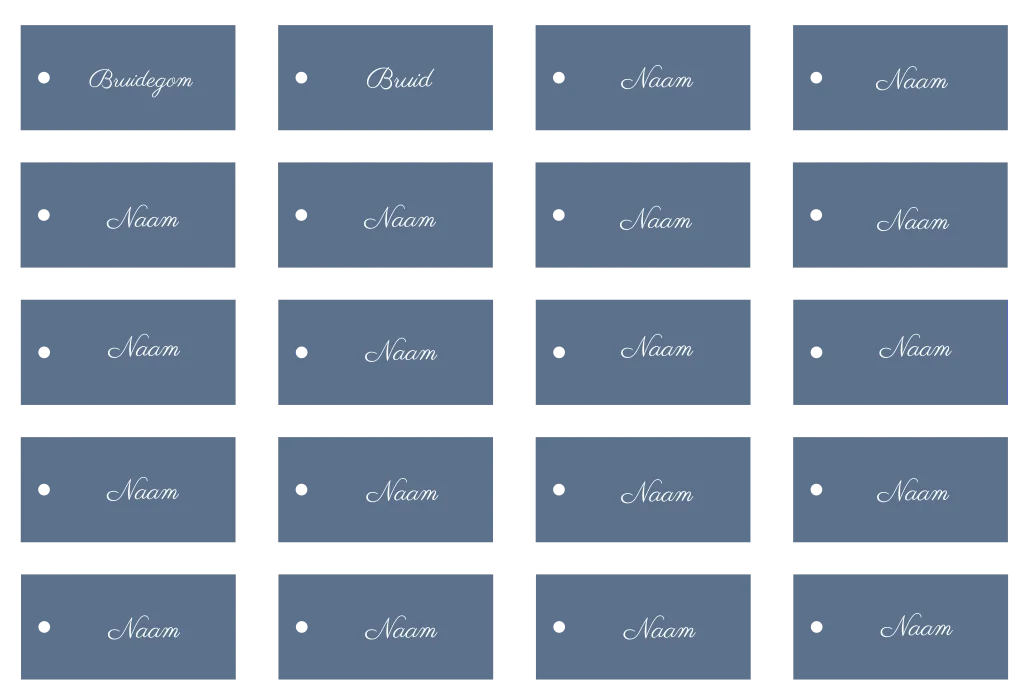 Blauwe naamkaartjes met een sierlijk lettertype. Deze naamkaartjes zijn voorzien van een klein gaatje, zodat je er een mooi lint doorheen kunt maken. Zo maak je de trouwhuisstijl voor jullie bruiloft helemaal compleet! Er zitten 20 stuks op 1 vel die je tegelijk kunt bewerken in de editor.