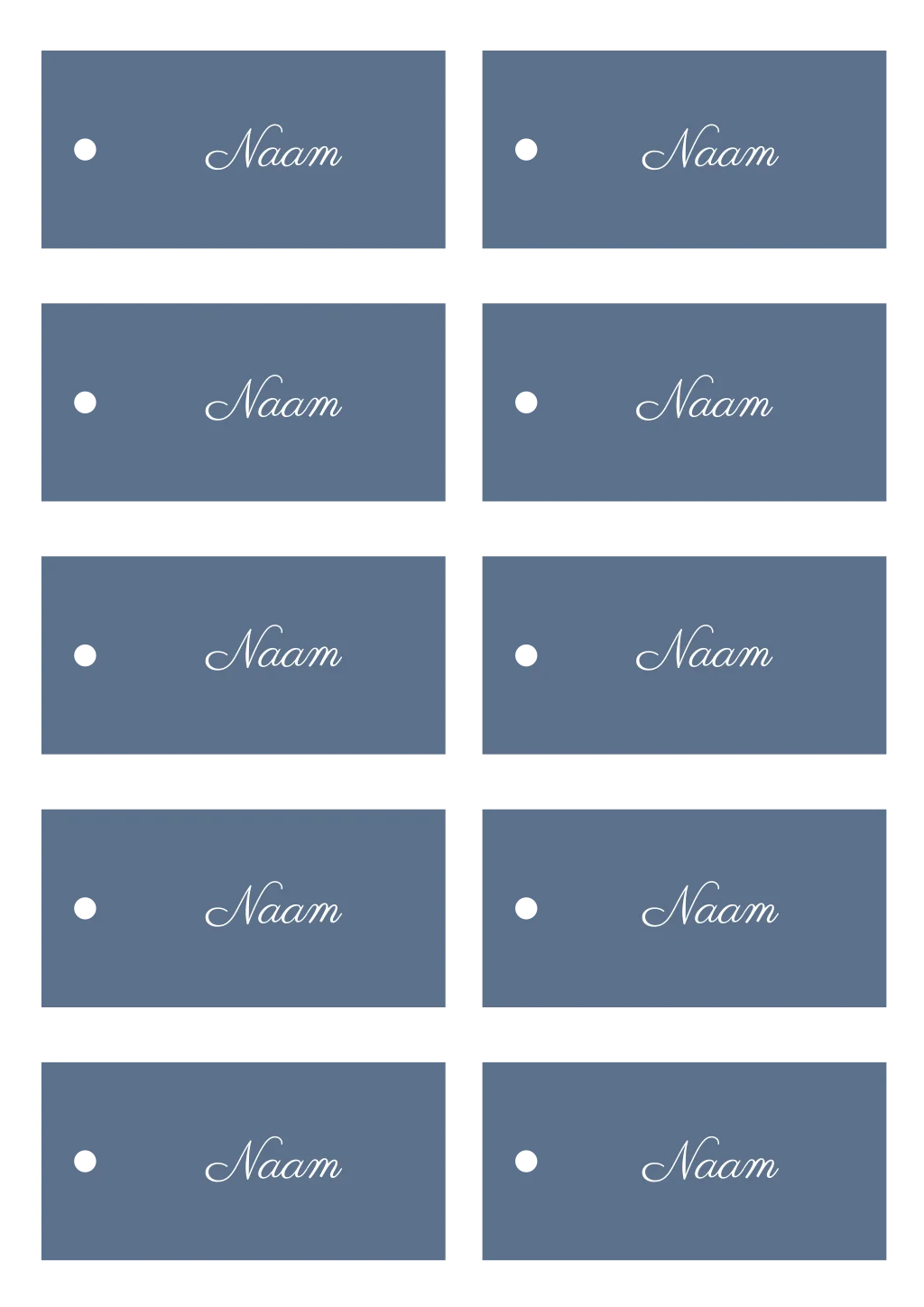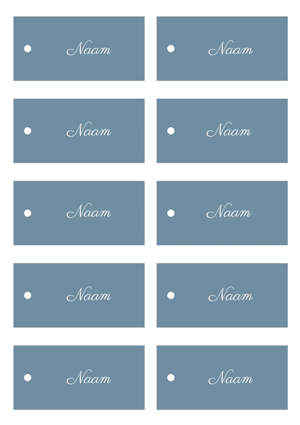Blauwe naamkaartjes met sierlijke letters en een klein gaatje. Door het gaatje kun je een mooi lint knopen. Het naamkaartje heeft een formaat van 9x4,5 cm. Er zitten 10 stuks op 1 vel die je tegelijk kunt bewerken in de editor. Het chiffon lint moet je er nog los bij bestellen en dit kun je vinden bij alle accessoires op de pagina Extra's.
