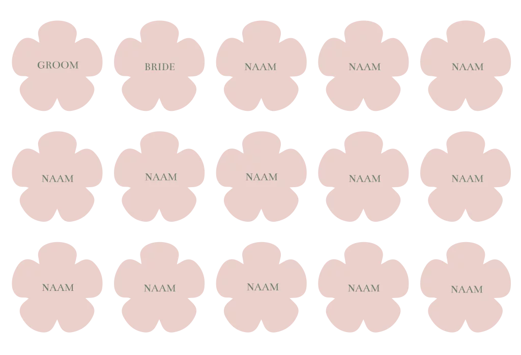 Naamkaartjes in in de vorm van een bloem voor bij diner bruiloft. Het naamkaartje heeft een formaat van 8x8cm. Er zitten 15 stuks op 1 vel die je tegelijk kunt bewerken in de editor.