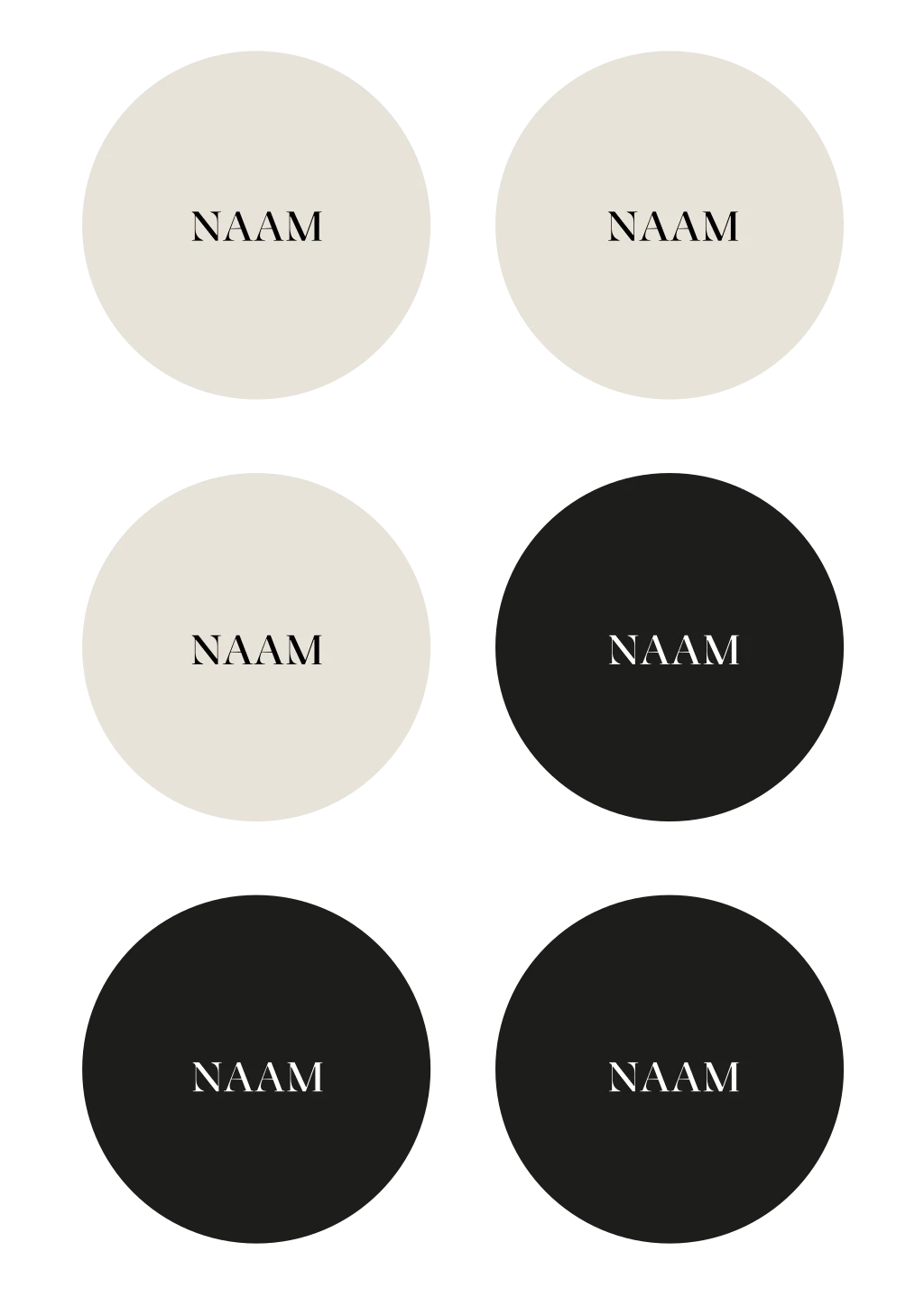 Ronde naamkaartjes in zwart en beige voor bij diner bruiloft. Het naamkaartje heeft een formaat van 8x8cm. Er zitten 6 stuks op 1 vel die je tegelijk kunt bewerken in de editor.