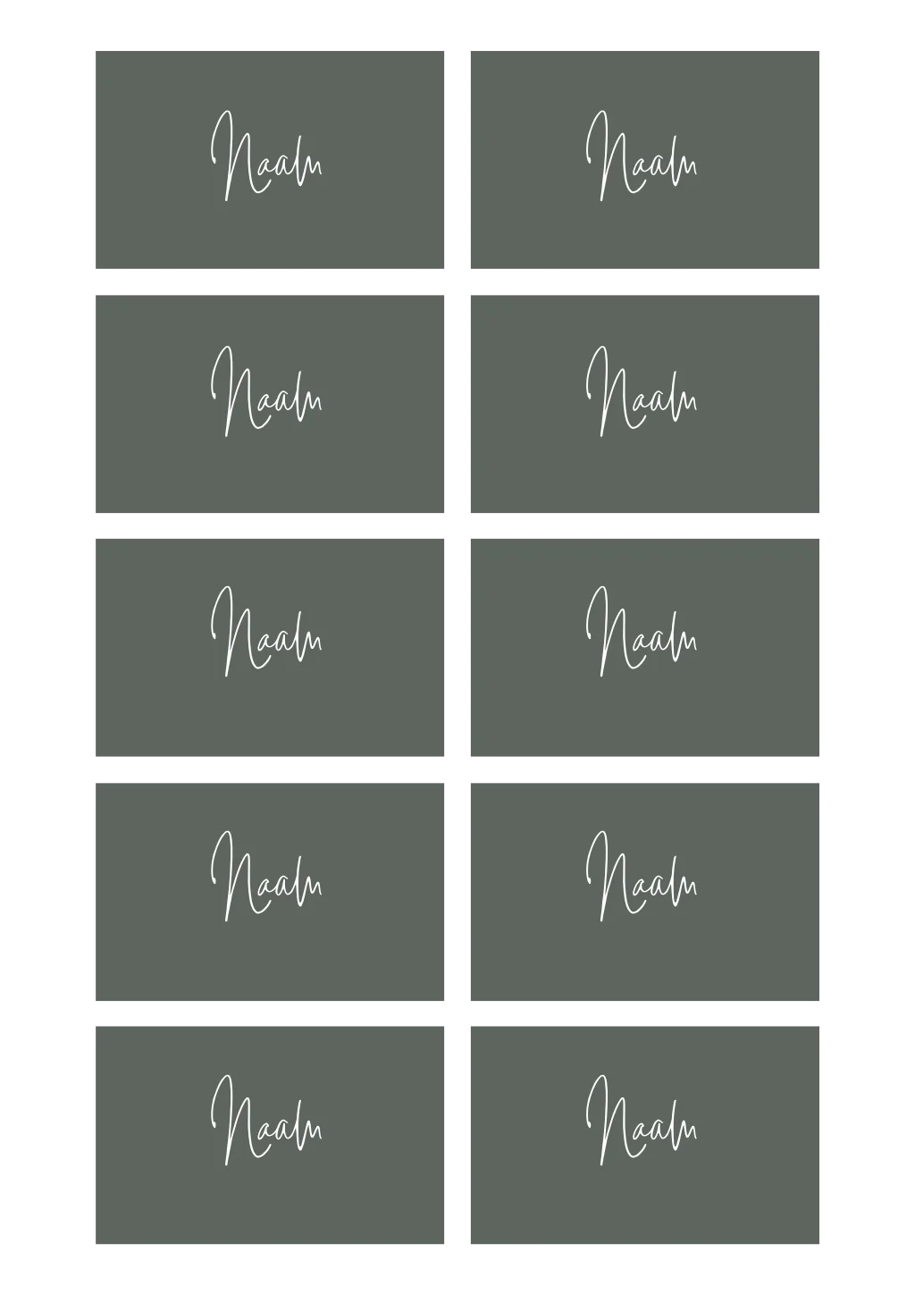Naamkaartjes in de kleur donkergroen met sierlijke witte letters, aan te passen naar wens voor jullie bruiloft. Formaat: 8x5 cm (visitekaartje), enkelzijdig bedrukt.
