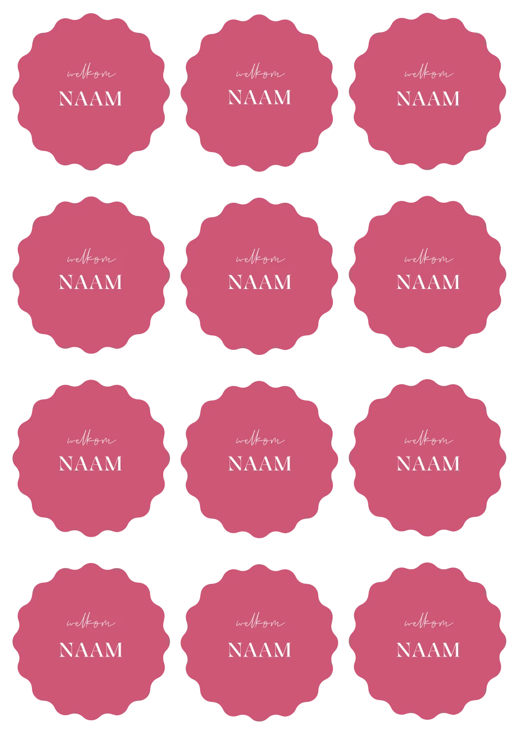 Golvend ronde naamkaartjes in knal roze kleur voor bij diner bruiloft. Het naamkaartje heeft een formaat van 6,5x6,5 cm. Er zitten 12 stuks op 1 vel die je tegelijk kunt bewerken in de editor.