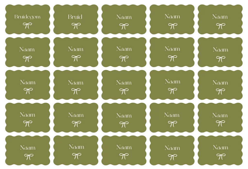 Olijf groene naamkaartjes met strikje voor bij het diner van jullie bruiloft met golvende vorm. 25 stuks naamkaartjes van 8x5 cm (formaat visitekaartje) in de stijl van jullie trouwkaart. Thema: Chic Bow