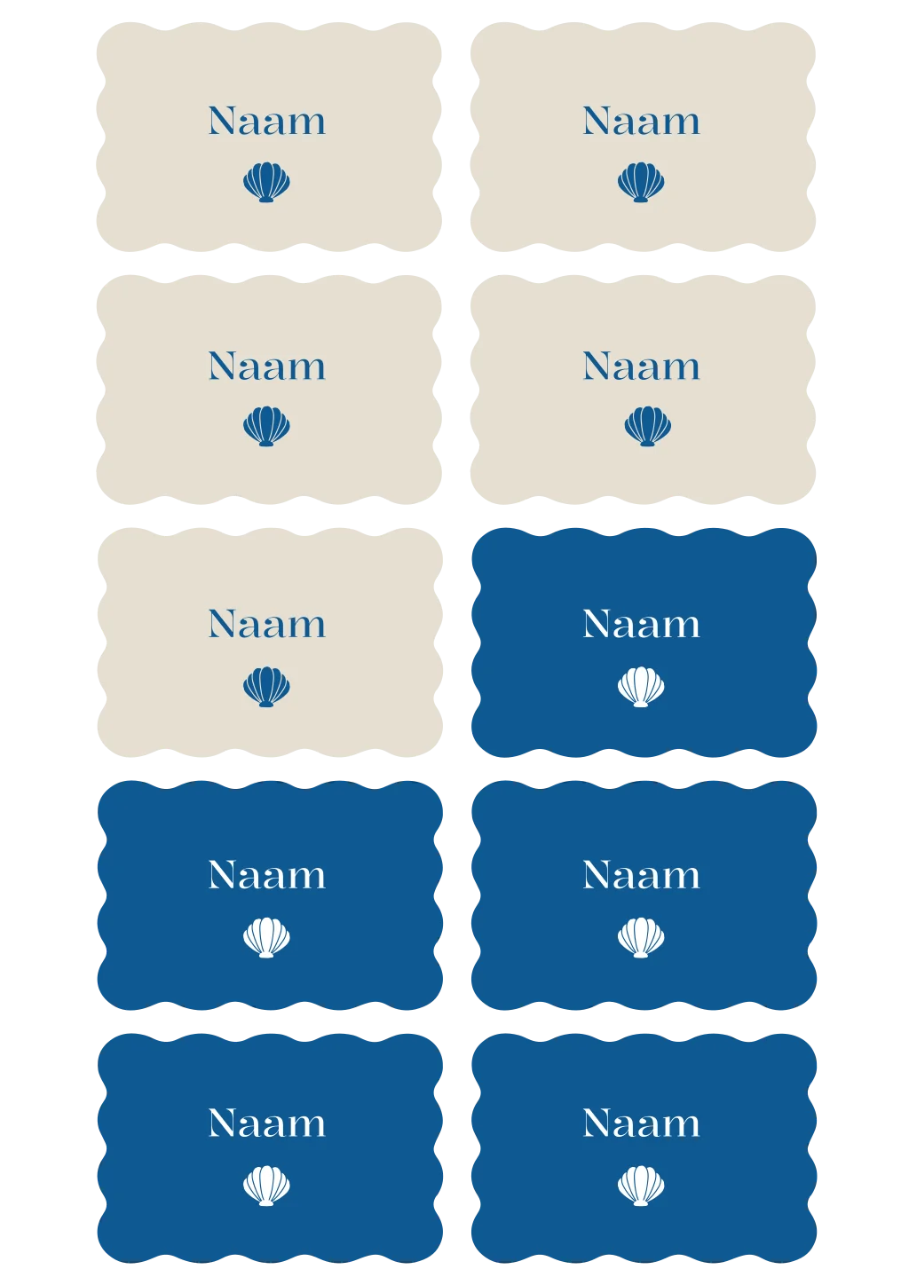 Golvende naamkaartjes met schelp voor bij het diner van jullie bruiloft in blauwe en beige kleur. 10 stuks naamkaartjes van 8x5 cm (formaat visitekaartje) in de stijl van jullie trouwkaart.| Totaalprijs: 0 |