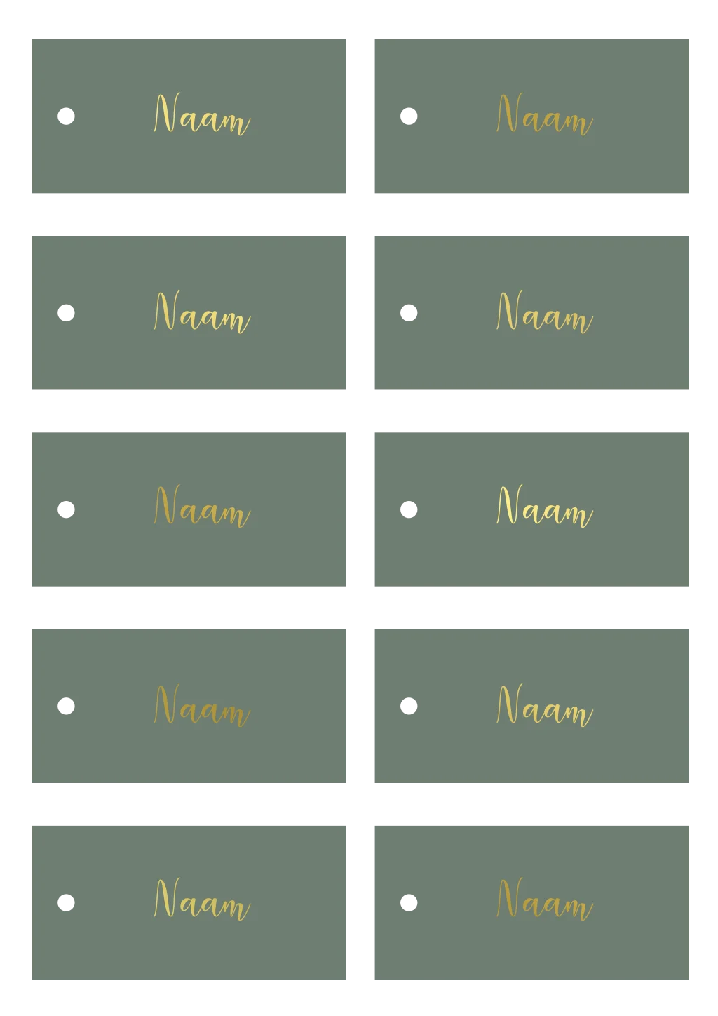 Groene naamkaartjes met goudfolie letters en een klein gaatje. Door het gaatje kun je een mooi lint knopen. Het naamkaartje heeft een formaat van 9x4,5 cm. Er zitten 10 stuks op 1 vel die je tegelijk kunt bewerken in de editor. Het chiffon lint moet je er nog los bij bestellen en dit kun je vinden bij alle accessoires op de pagina Extra's.