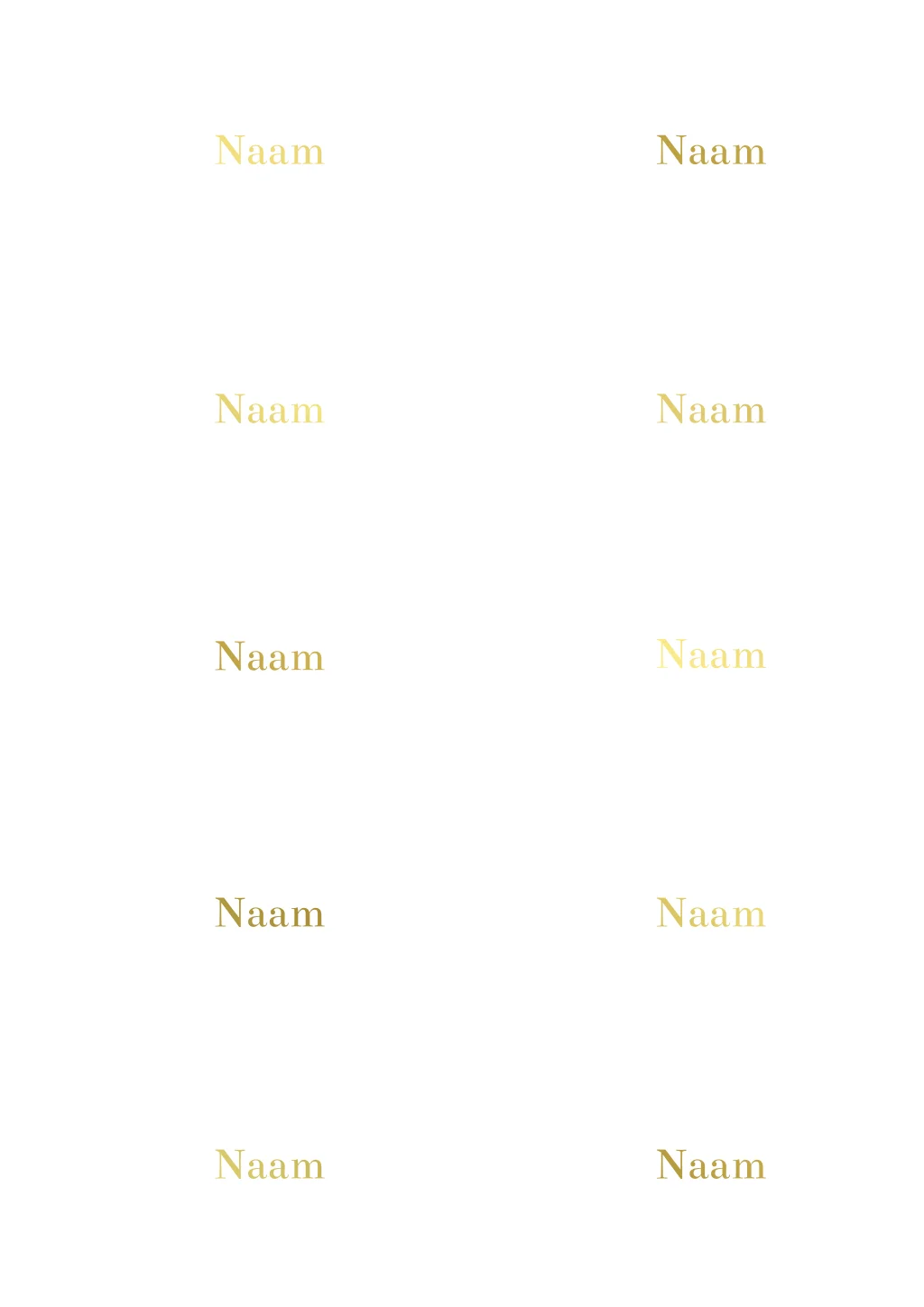 Witte klassieke naamkaartjes met gouden sierlijke letters en een klein gaatje. Door het gaatje kun je een mooi lint knopen. Het naamkaartje heeft een formaat van 9x4,5 cm. Er zitten 10 stuks op 1 vel die je tegelijk kunt bewerken in de editor. Het chiffon lint moet je er nog los bij bestellen en dit kun je vinden bij alle accessoires op de pagina Extra's.