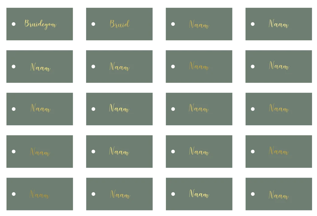 Groene naamkaartjes met gouden sierlijke letters en een klein gaatje. Door het gaatje kun je een mooi lint knopen. Het naamkaartje heeft een formaat van 9x4,5 cm. Er zitten 20 stuks op 1 vel die je tegelijk kunt bewerken in de editor. Thema: Shining Love