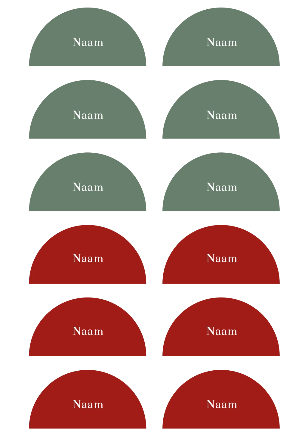 Boogvorm naamkaartjes in kerst stijl voor bij jullie christmas wedding! Deze naamkaartjes kun je met een paperclip vastmaken aan de bijbehorende menukaart. Dit is een vel met 12 stuks naamkaartjes van 8x4 cm en je kunt in de editor alle namen op het vel tegelijk invullen.| Totaalprijs: 0 |