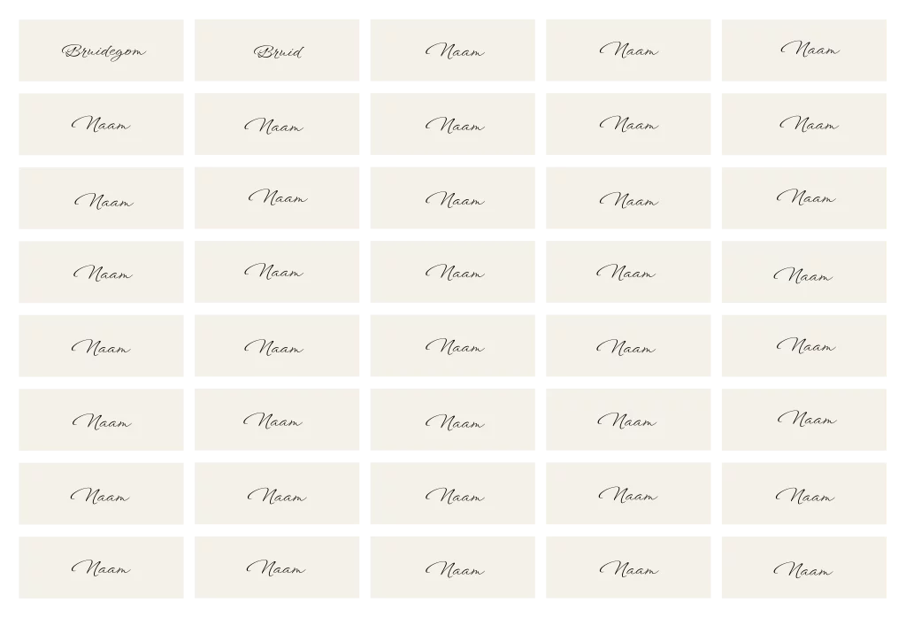 Beige naamkaartjes met sierlijke letters voor bij het diner op jullie bruiloft. Deze label naamkaartjes kun je met een paperclip vastmaken aan de menukaart. Er zitten 40 stuks naamkaartjes van 8x3 cm op 1 vel die je tegelijk in de editor kunt invullen.