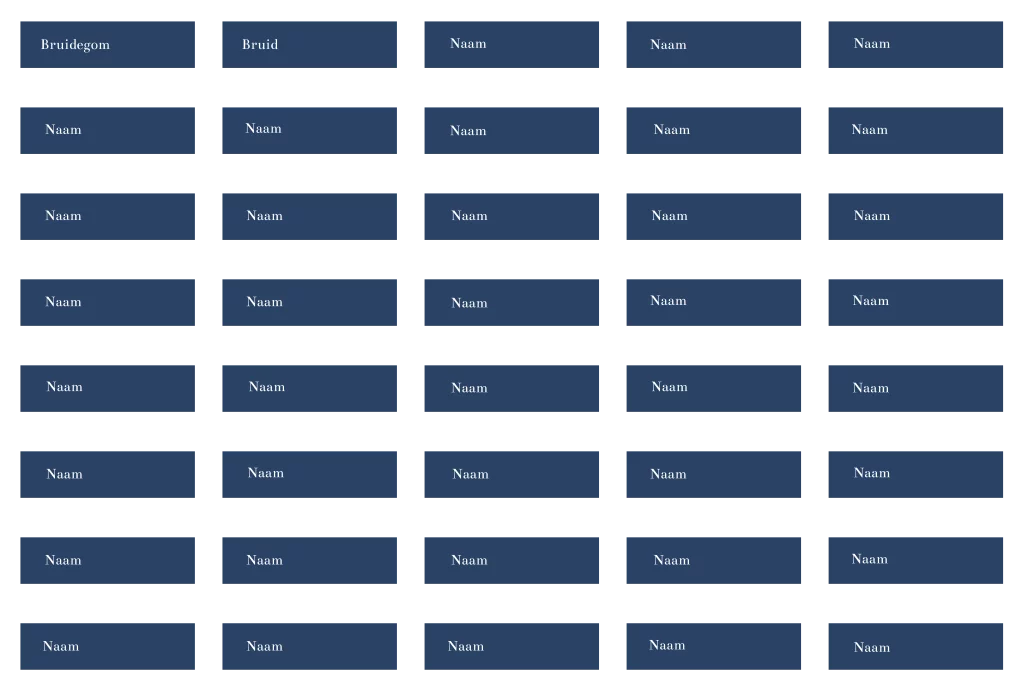 Donkerblauwe naamkaartjes voor jullie bruiloft in de stijl van de trouwkaart. Dit is een vel met 40 stuks naamkaartjes in de vorm van een label en je kunt in de editor alle namen op het vel tegelijk invullen. De naamkaartjes hebben een formaat van 8x3 cm en je kunt ze met een paperclip vastmaken aan de menukaart.| Totaalprijs: 0 |