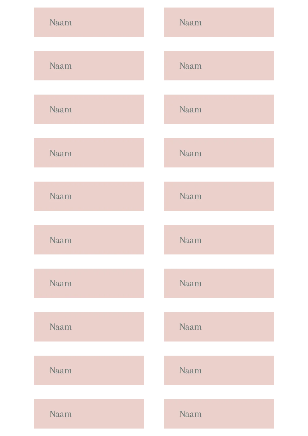 Lichtroze naamkaartjes voor bij het diner op jullie bruiloft. Deze label naamkaartjes kun je met een paperclip vastmaken aan de menukaart. Er zitten 20 stuks naamkaartjes op 1 vel die je tegelijk in de editor kunt invullen.| Totaalprijs: 0 |