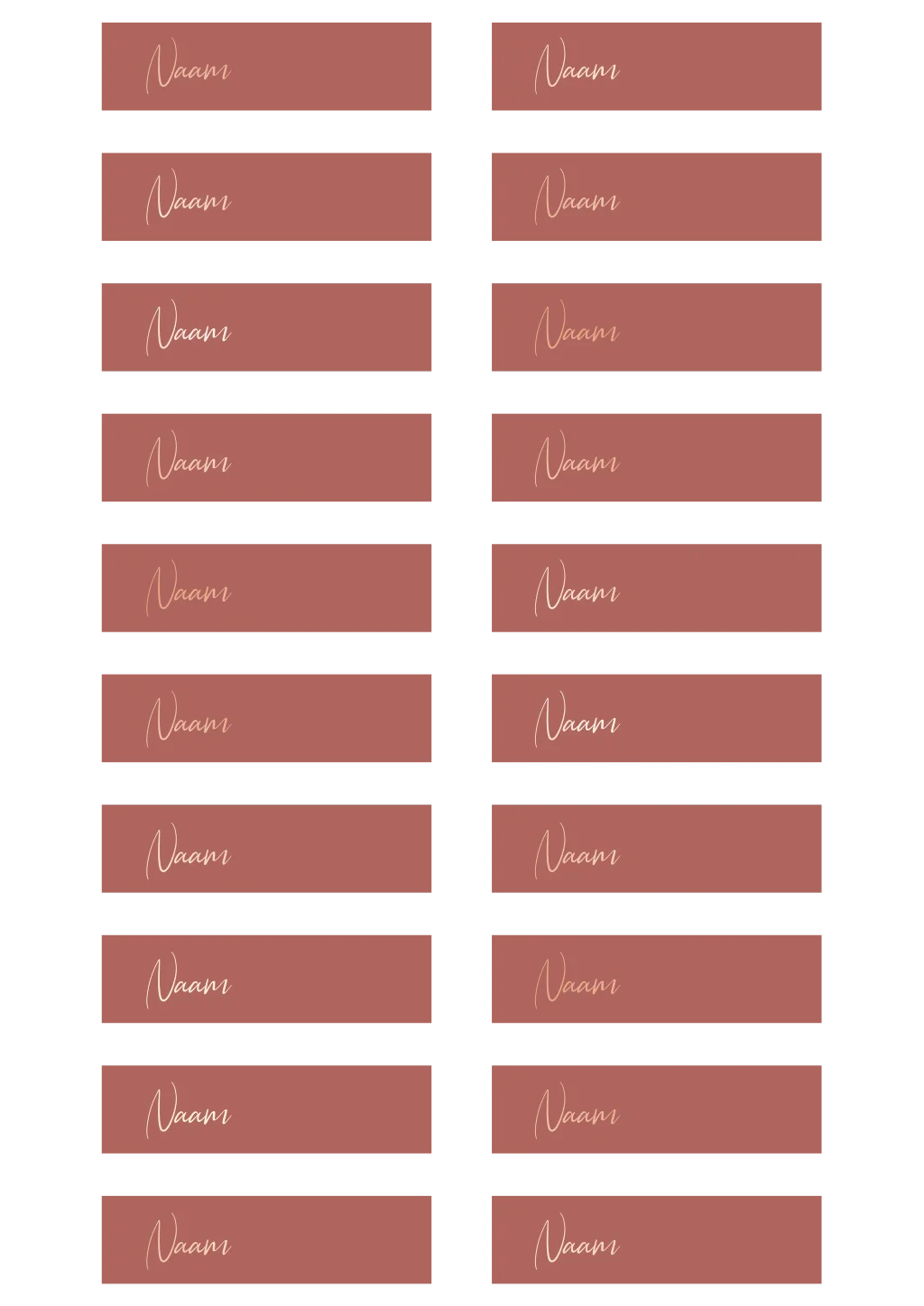 Roest rode naamkaartjes met rosefolie letters voor bij het diner op jullie bruiloft. Deze label naamkaartjes kun je met een paperclip vastmaken aan de menukaart. Er zitten 20 stuks naamkaartjes op 1 vel die je tegelijk in de editor kunt invullen.| Totaalprijs: 0 |