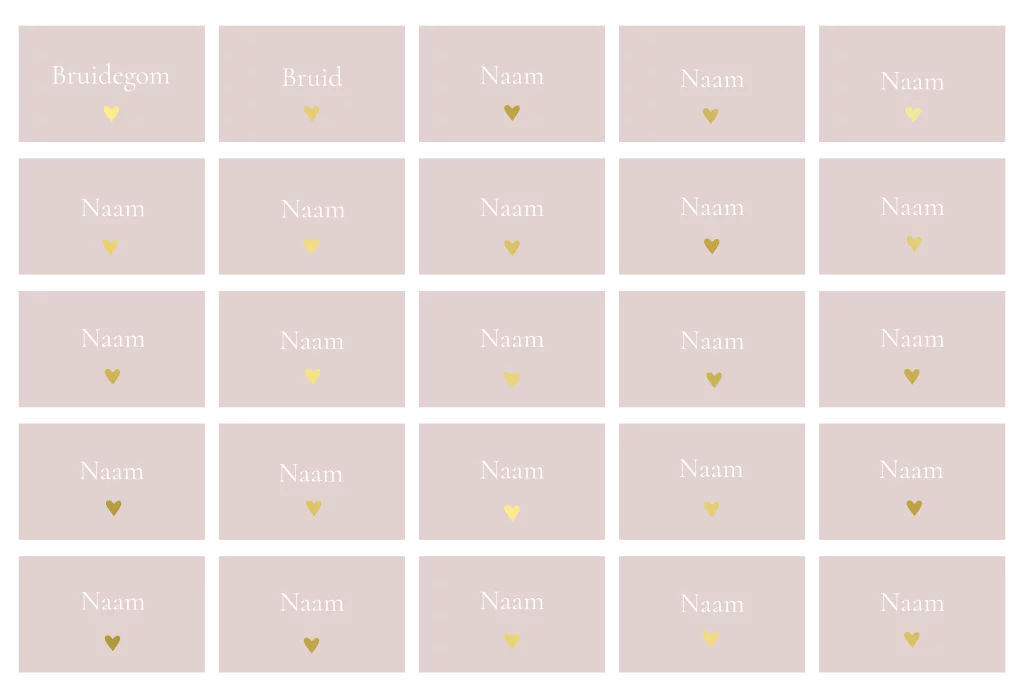 Lichtroze naamkaartjes met witte letters en goudfolie hartje voor jullie bruiloft in de stijl van de trouwkaart. Dit is een vel met 25 stuks naamkaartjes en je kunt in de editor alle namen op het vel tegelijk invullen. De naamkaartjes hebben een formaat van 8x5cm (formaat visitekaartje).