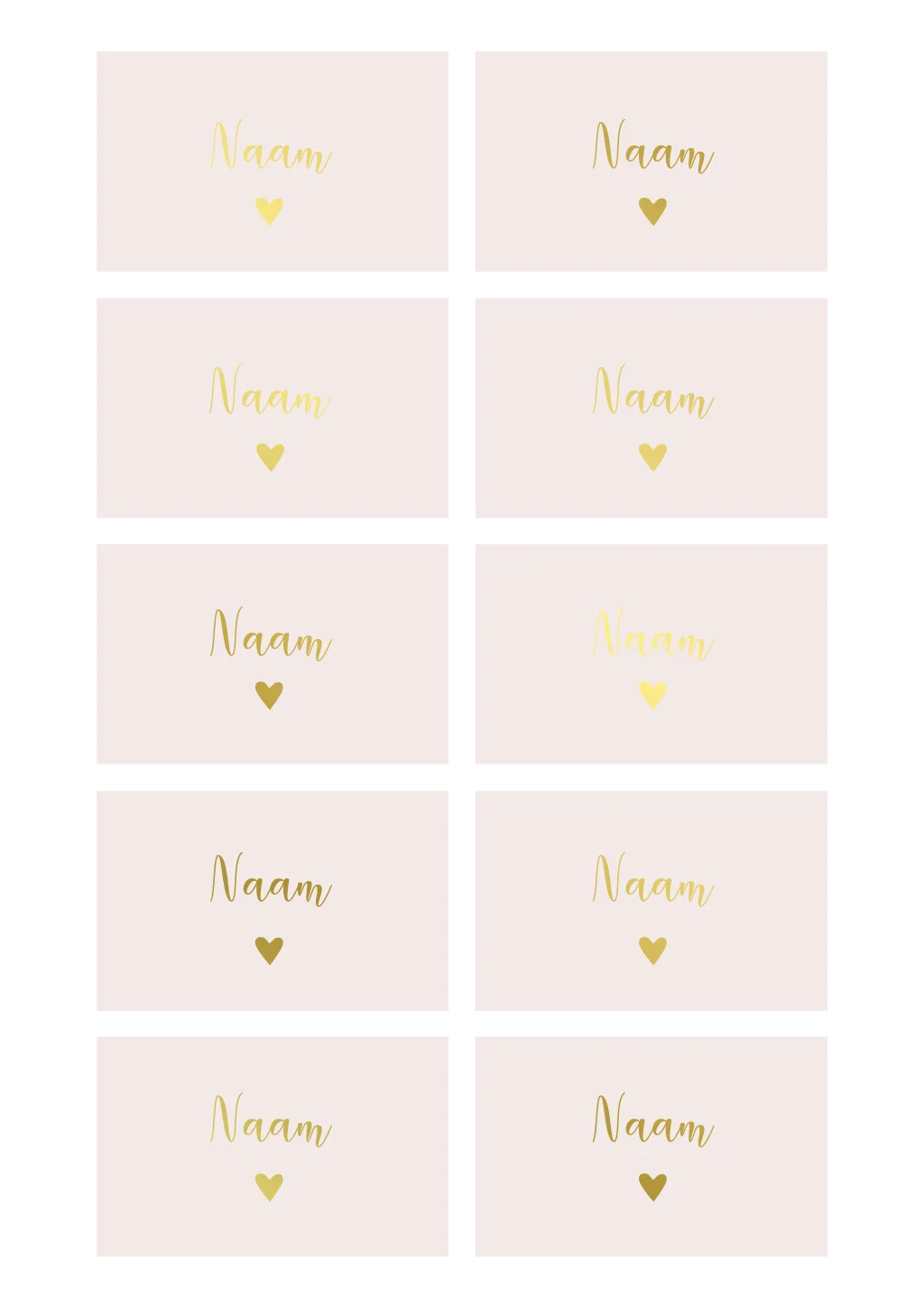 Lichtroze naamkaartjes met hartje en goudfolie, aan te passen naar de stijl van jullie trouwkaart. Formaat: 8x5 cm (visitekaartje), enkelzijdig bedrukt.
