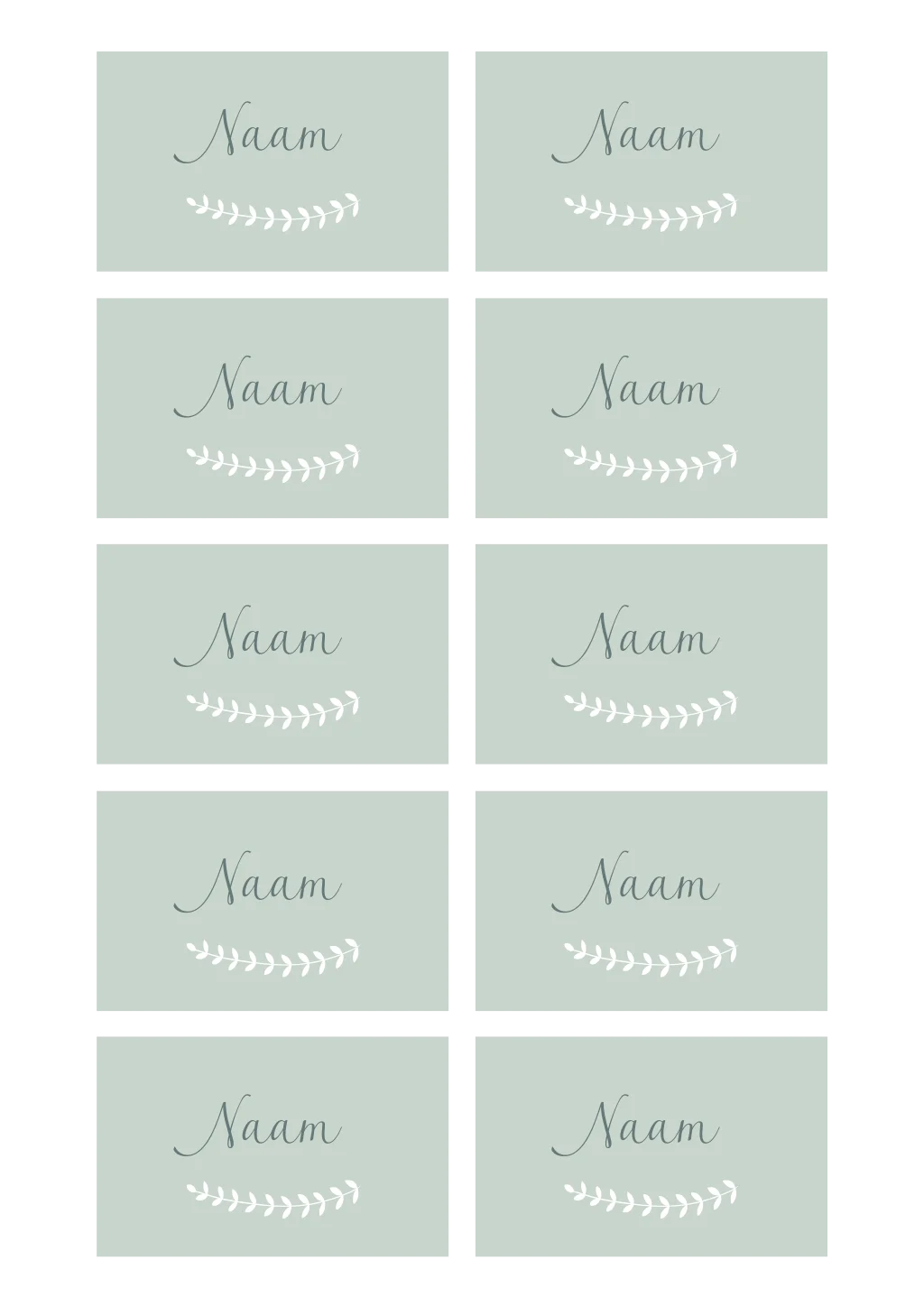Naamkaartjes in de kleur mintgroen, met sierlijke letters en wit takje, aan te passen naar de stijl van jullie trouwkaart. Formaat: 8x5 cm (visitekaartje), enkelzijdig bedrukt.