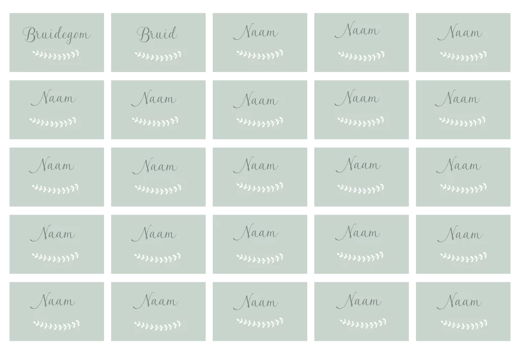 Mintgroene naamkaartjes met botanisch takje. 25 stuks van 8x5 cm. Pas de namen in een keer aan in de editor. De kleur is ook naar wens aan te passen.