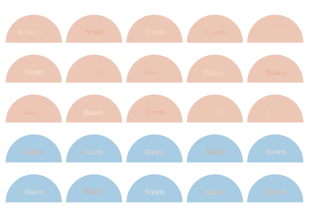 Moderne naamkaartjes voor jullie bruiloft in de stijl van de trouwkaart in peach en blauw. Deze boogvorm kaartjes kun je met een paperclip aan de menukaart bevestigen. Dit is een vel met 25 stuks naamkaartjes en je kunt in de editor alle namen op het vel tegelijk invullen. De naamkaartjes hebben een formaat van 8x4 cm.