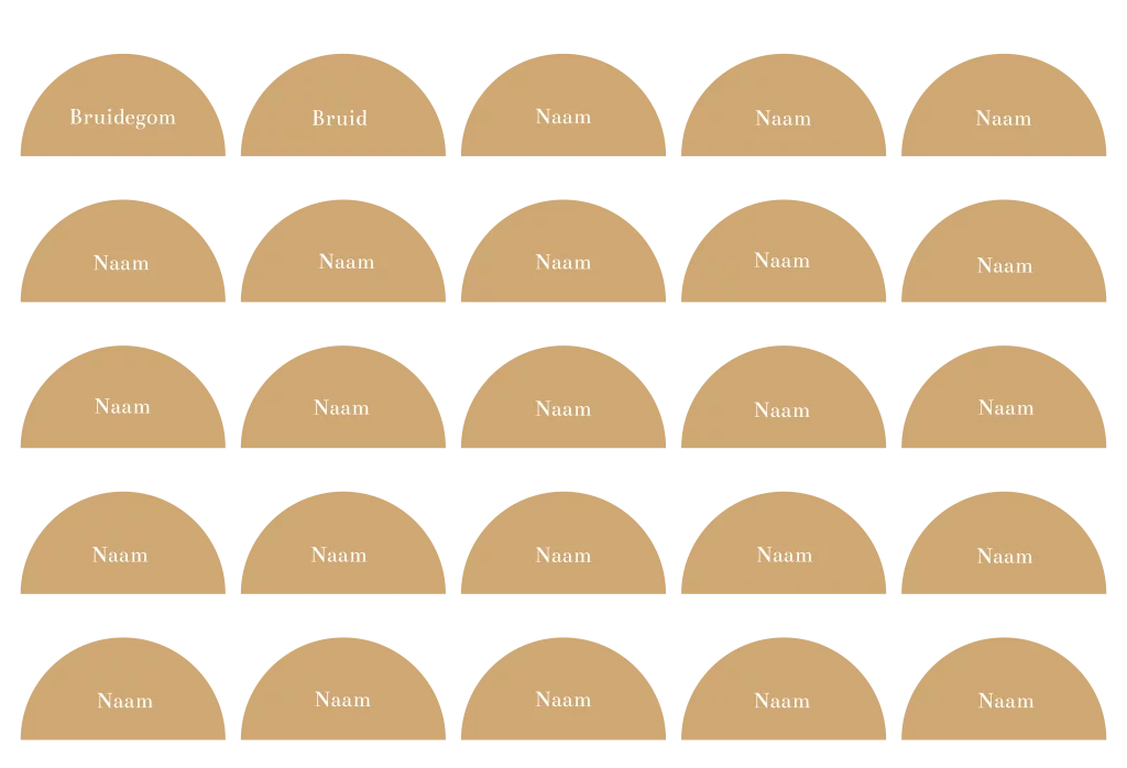 Okergele naamkaartjes in een boogvorm met een klassiek lettertype. Deze menukaartjes kun je met een paperclip vastmaken aan de menukaart die hierbij past. Zo maak je de trouwhuisstijl voor jullie bruiloft helemaal compleet! Er zitten 25 stuks op 1 vel die je tegelijk kunt bewerken in de editor.