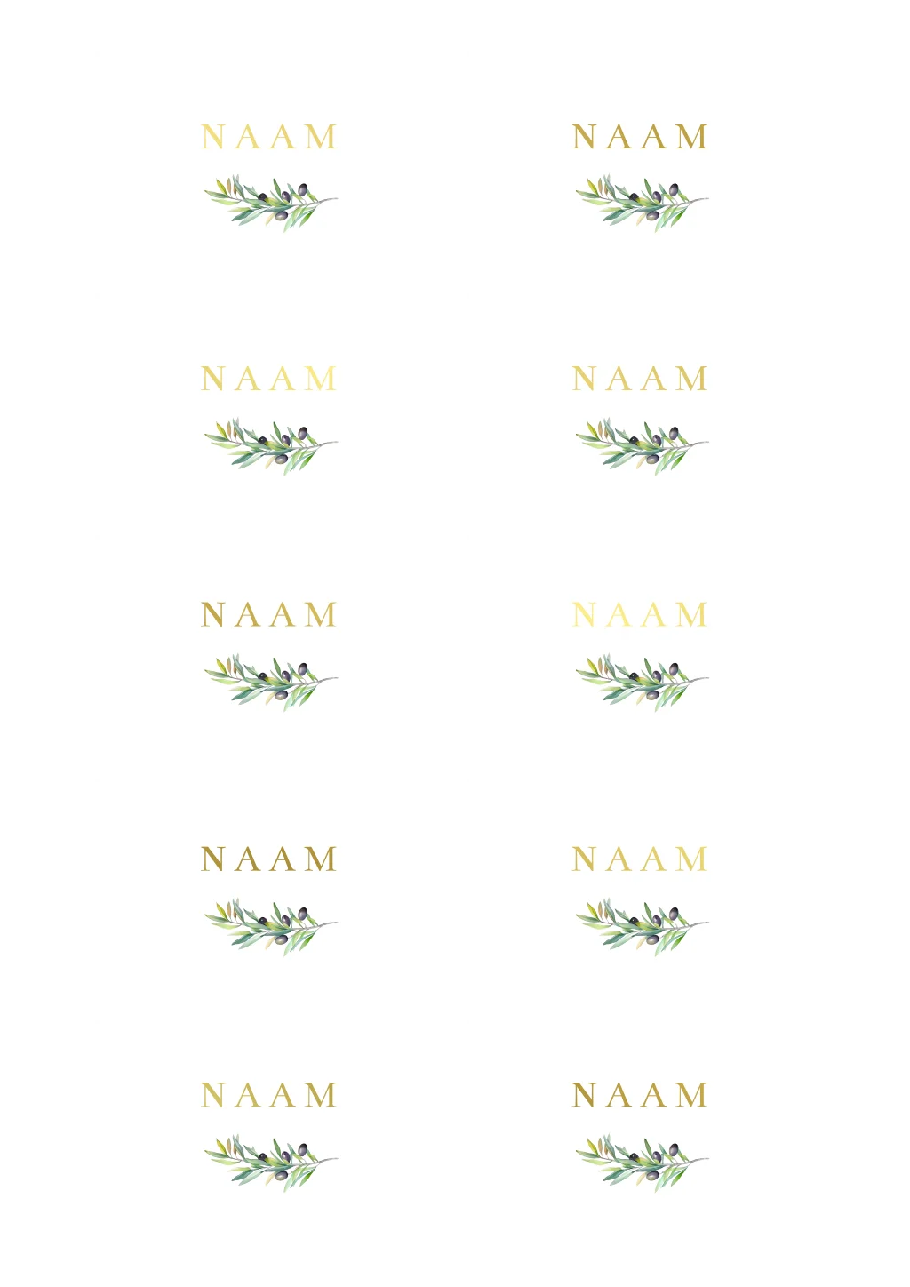 Naamkaartjes met olijftakje en goudfolie, aan te passen naar de stijl van jullie bruiloft. Formaat: 8x5 cm (visitekaartje), enkelzijdig bedrukt.