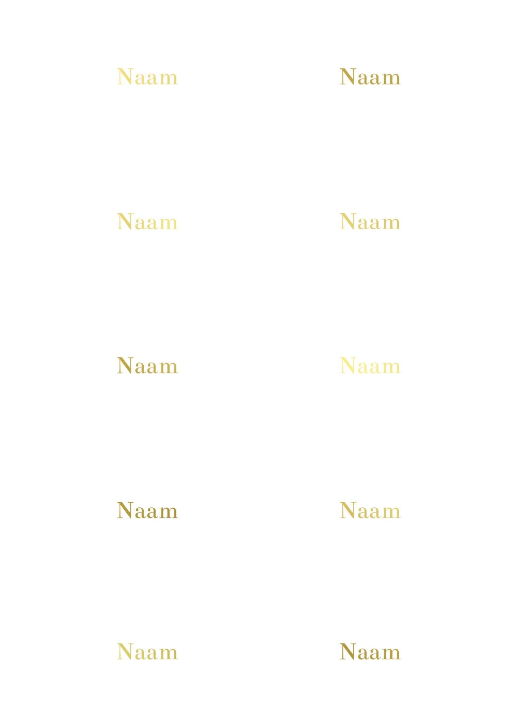 Ovalen witte naamkaartjes met goudfolie letters. Het naamkaartje heeft een formaat van 8x5 cm. Er zitten 10 stuks op 1 vel die je tegelijk kunt bewerken in de editor.