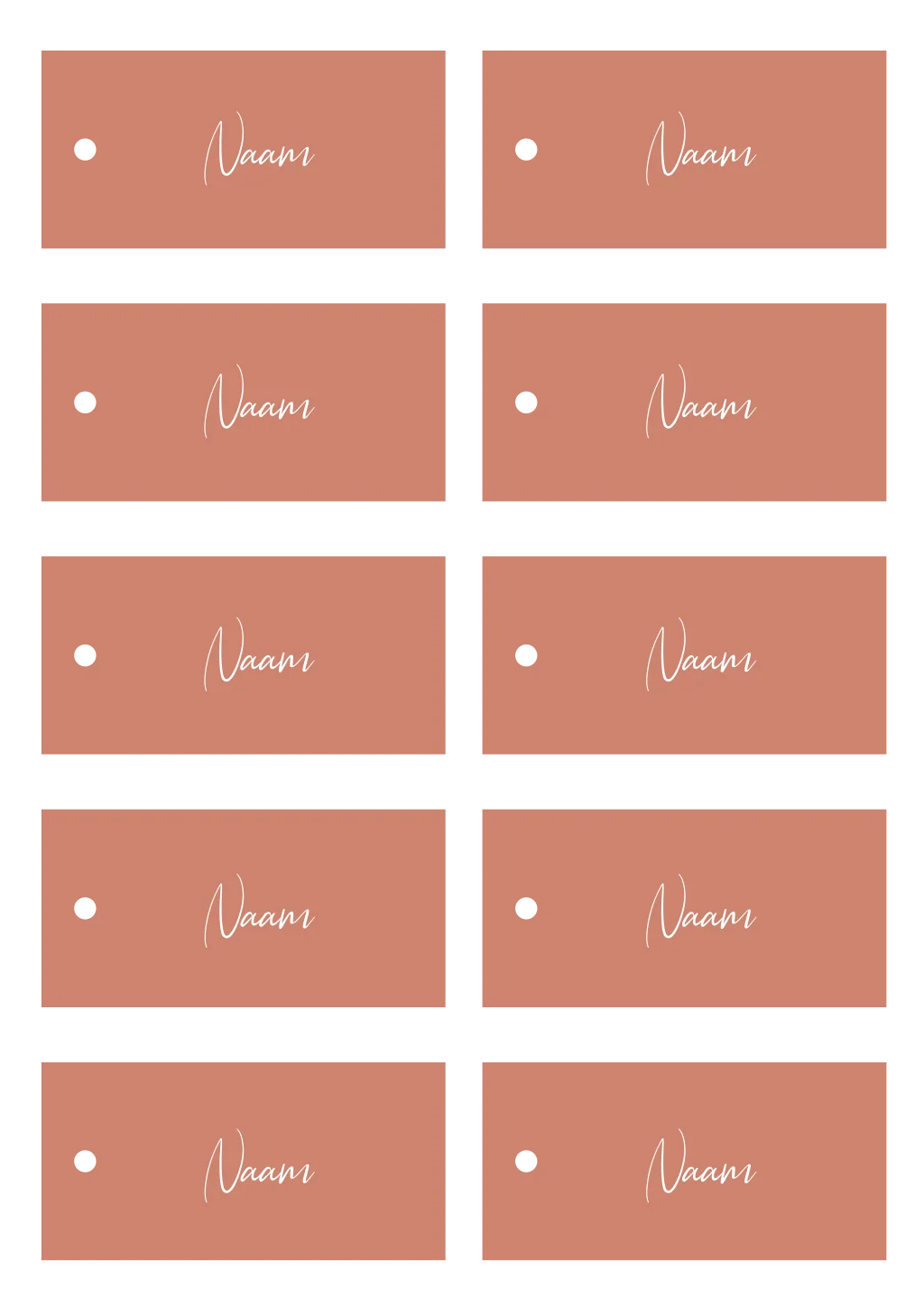 Roest kleurige naamkaartjes met sierlijke letters en een klein gaatje. Door het gaatje kun je een mooi lint knopen. Het naamkaartje heeft een formaat van 9x4,5 cm. Er zitten 10 stuks op 1 vel die je tegelijk kunt bewerken in de editor. Het chiffon lint moet je er nog los bij bestellen en dit kun je vinden bij alle accessoires op de pagina Extra's.