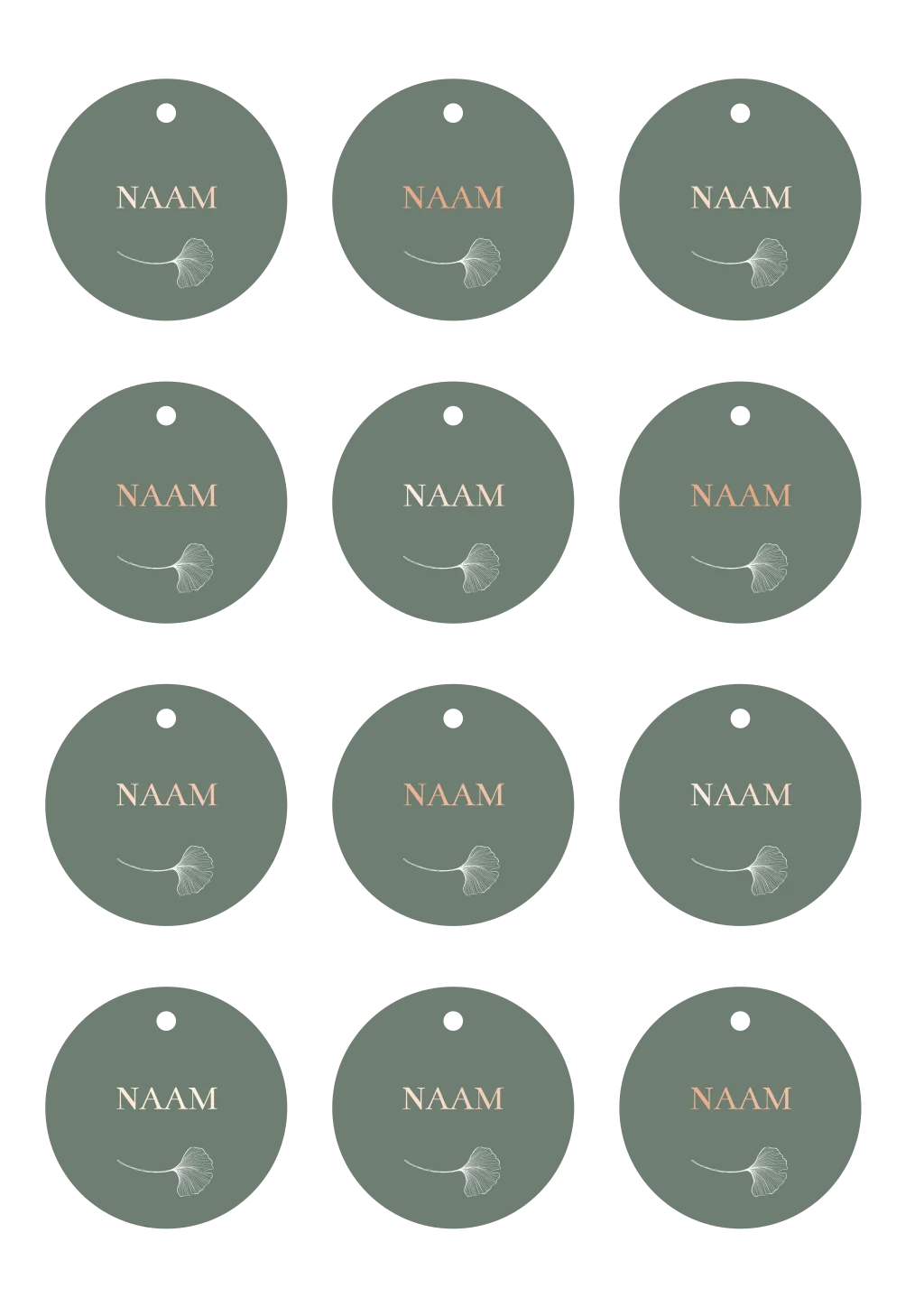 Ronde groene naamkaartjes met rosefolie letters en ginkgo blaadje. Het naamkaartje heeft een formaat van 5,5x5,5 cm en heeft een boorgaatje, zodat je er een lintje doorheen kunt doen. Er zitten 12 stuks op 1 vel die je tegelijk kunt bewerken in de editor.