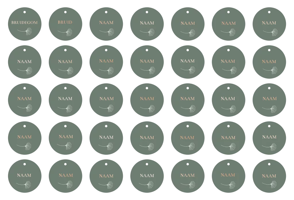 Naamkaartjes voor jullie bruiloft in de stijl van de trouwkaart. Dit is een vel met 35 stuks ronde naamkaartjes en je kunt in de editor alle namen op het vel tegelijk invullen. De naamkaartjes hebben een formaat van 5x5 cm en hebben een klein gaatje. Je kunt de kaartjes bijvoorbeeld vastbinden met een touwtje om een servet heen.