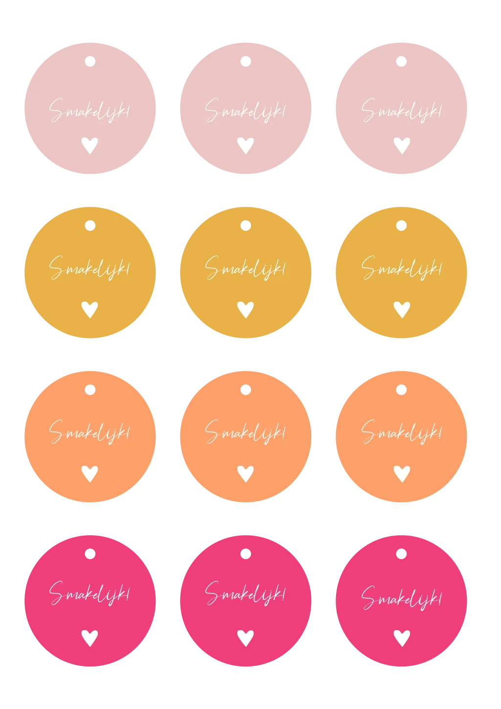 Ronde gekleurde naamkaartjes met hartje. Het naamkaartje heeft een formaat van 5,5x5,5 cm en heeft een boorgaatje, zodat je er een lintje doorheen kunt doen. Er zitten 12 stuks op 1 vel die je tegelijk kunt bewerken in de editor.