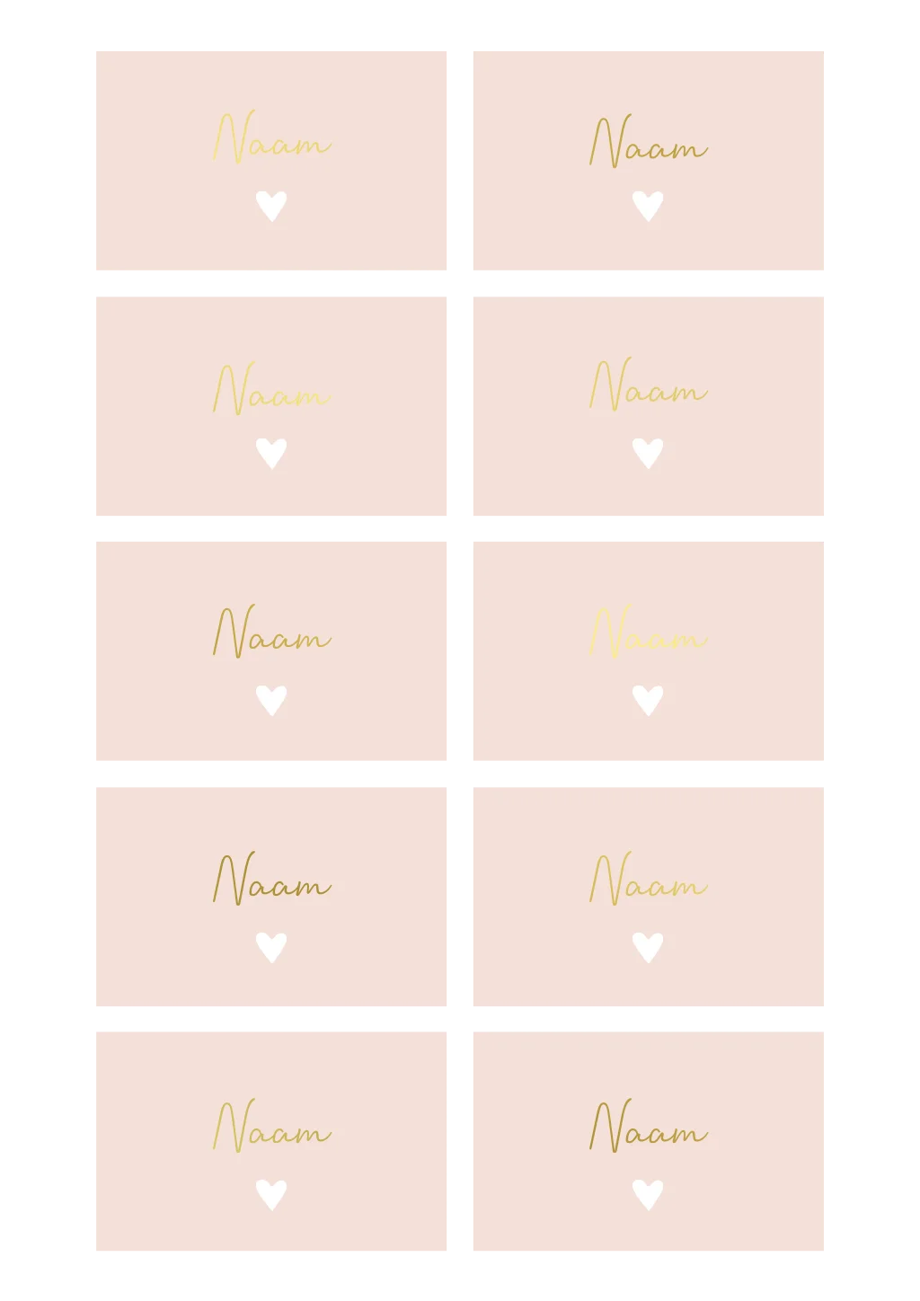 Naamkaartjes met lichtroze kleur, sierlijke goudfolie letters en wit hartje, aan te passen naar de stijl van jullie trouwkaart. Formaat: 8x5 cm (visitekaartje), enkelzijdig bedrukt.