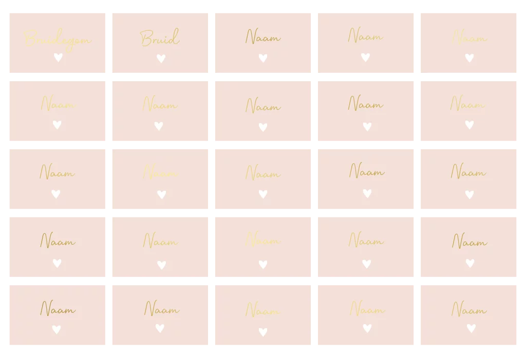 Roze naamkaartjes met goudfolie letters en wit hartje. Op het vel staan 25 naamkaartjes van 8x5 cm. Kleur en namen zijn in de editor makkelijk aan te passen.