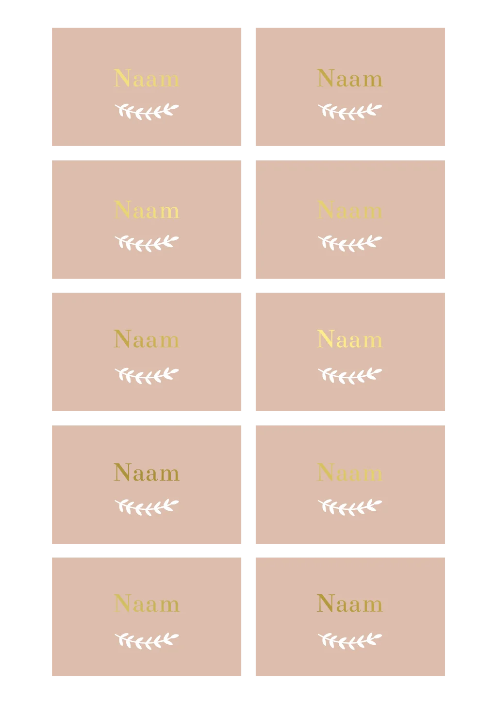 Naamkaartjes in de kleur roze met wit takje en letters in goudfolie, aan te passen naar wens voor jullie bruiloft. Formaat: 8x5 cm (visitekaartje), enkelzijdig bedrukt.| Totaalprijs: 0 |