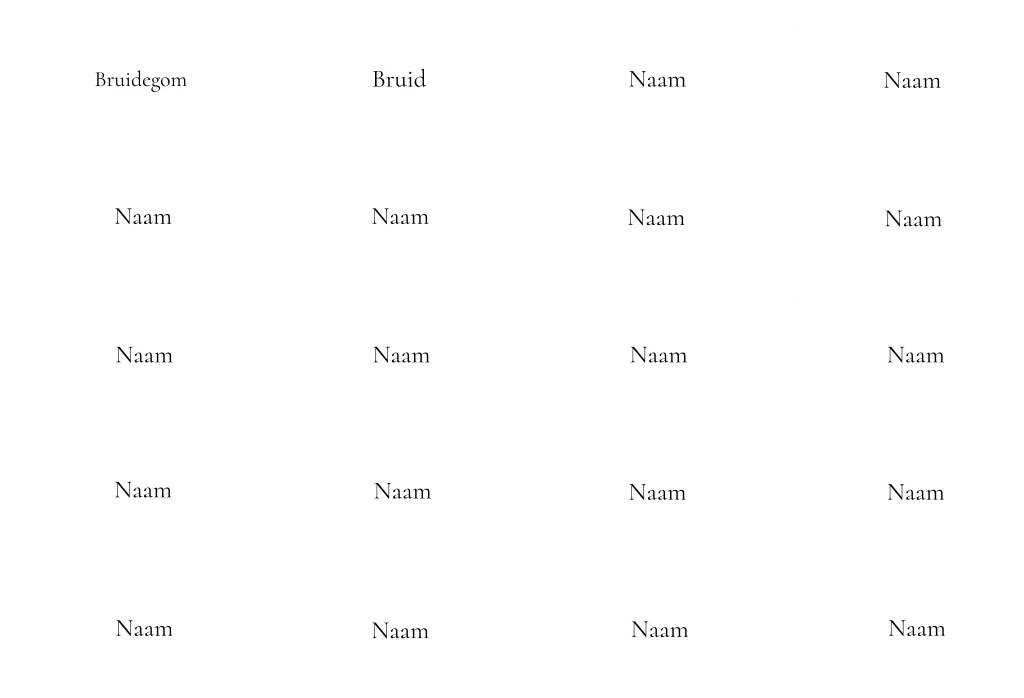 Witte naamkaartjes met een klassiek lettertype. Deze naamkaartjes zijn voorzien van een klein gaatje, zodat je er een mooi lint doorheen kunt maken. Zo maak je de trouwhuisstijl voor jullie bruiloft helemaal compleet! Er zitten 20 stuks op 1 vel die je tegelijk kunt bewerken in de editor.