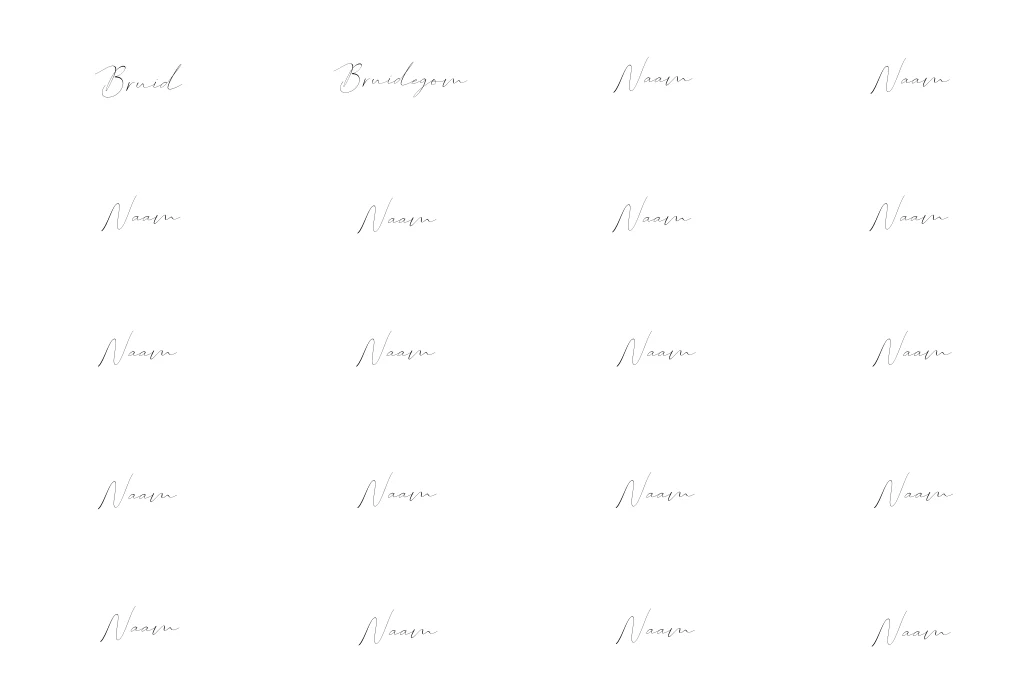 Chique witte naamkaartjes met een sierlijk zwart lettertype. Deze naamkaartjes zijn voorzien van een klein gaatje, zodat je er een mooi lint doorheen kunt maken. Zo maak je de trouwhuisstijl voor jullie bruiloft helemaal compleet! Er zitten 20 stuks op 1 vel die je tegelijk kunt bewerken in de editor.