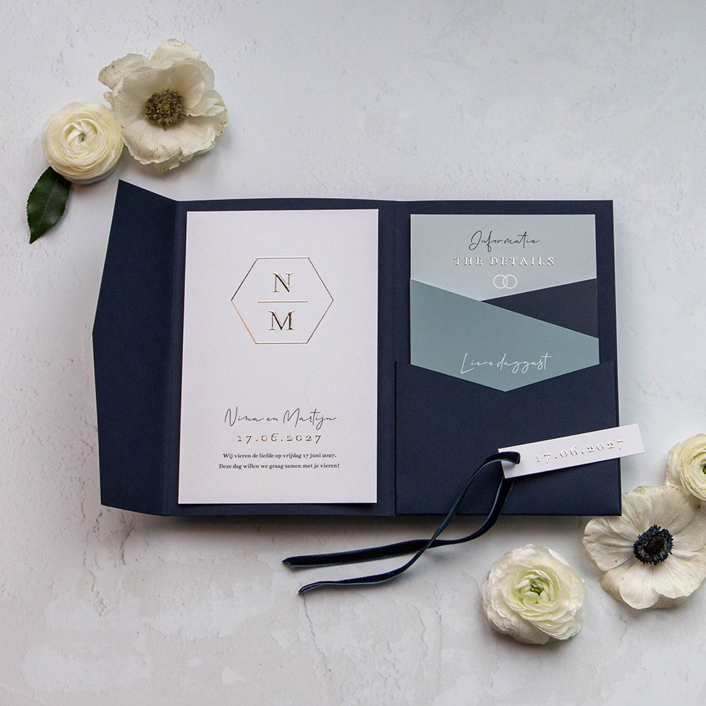 Pocketfold trouwkaart blauw geometrisch goudfolie