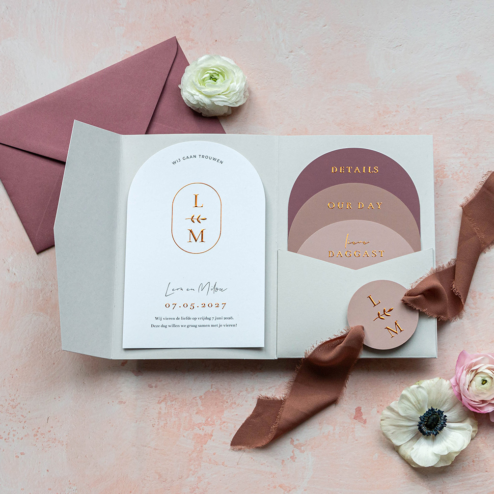 Moderne pocketfold trouwkaart met boogvorm en rosefolie voor jullie bruiloft! Deze uitnodiging heeft rode, bruine en roest kleurige tinten. Dit bestand voor de inlegkaartjes kun je zelf nog naar wens aanpassen. De pocketfold mapjes en accessoires bestel je er nog los bij. De linkerkaart plak je met een lijmstick in de kaart en de overige inlegkaartjes schuif je in het mapje. Formaten: 17x11 cm, 17x10,5 cm, 14x10,5, 11x10,5 cm en 5,5x5,5 cm. Kleur mapje foto: Cloud Grey