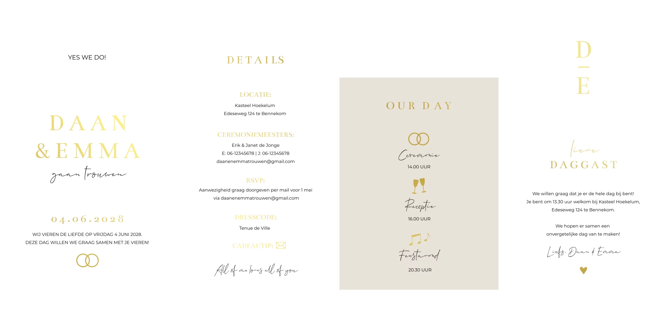 Ontwerp een chique pocketfold trouwkaart met goudfolie voor jullie bruiloft! Dit bestand voor de inlegkaartjes kun je zelf nog naar wens aanpassen. De pocketfold mapjes en accessoires bestel je er nog los bij. De linkerkaart plak je met een lijmstick in de kaart en de overige inlegkaartjes schuif je in het mapje. Formaten: 17x11 cm, 17x10,5 cm, 14x10,5, 11x10,5 cm en 5,5x5,5 cm. Kleur mapje foto: Cloud Grey