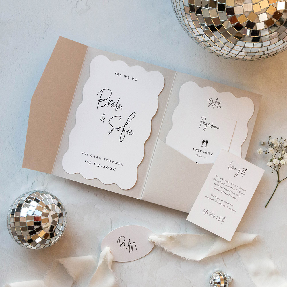 Ontwerp een moderne pocketfold trouwkaart met golf vorm voor jullie bruiloft! Dit bestand voor de inlegkaartjes kun je zelf nog naar wens aanpassen. De pocketfold mapjes en accessoires bestel je er nog los bij. De linkerkaart plak je met een lijmstick in de kaart en de overige inlegkaartjes schuif je in het mapje. Formaten: 17x11 cm, 17x10,5 cm, 14x7, 11x7 cm en 7,5x5 cm. Kleur mapje foto: Cloud Grey