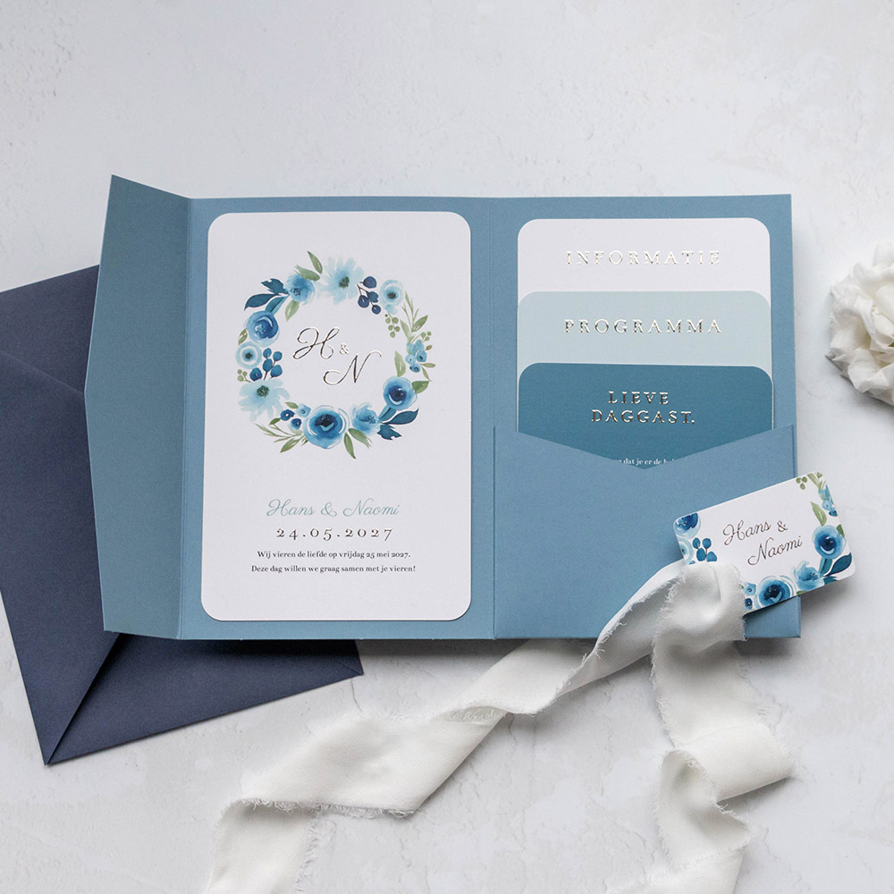 Klassieke pocketfold trouwkaart met blauwe watercolor bloemen, goudfolie, een trouwlogo met krans, ronde hoeken en blauwe tinten. Dit bestand voor de inlegkaartjes kun je zelf nog naar wens aanpassen. De pocketfold mapjes en accessoires bestel je er nog los bij. De linkerkaart plak je met een lijmstick in de kaart en de overige inlegkaartjes schuif je in het mapje. Formaten: 17x11 cm, 17x10,5 cm, 14x10,5 cm, 11x10,5 en 7x4,5 cm. Kleur mapje foto: Misty Blue