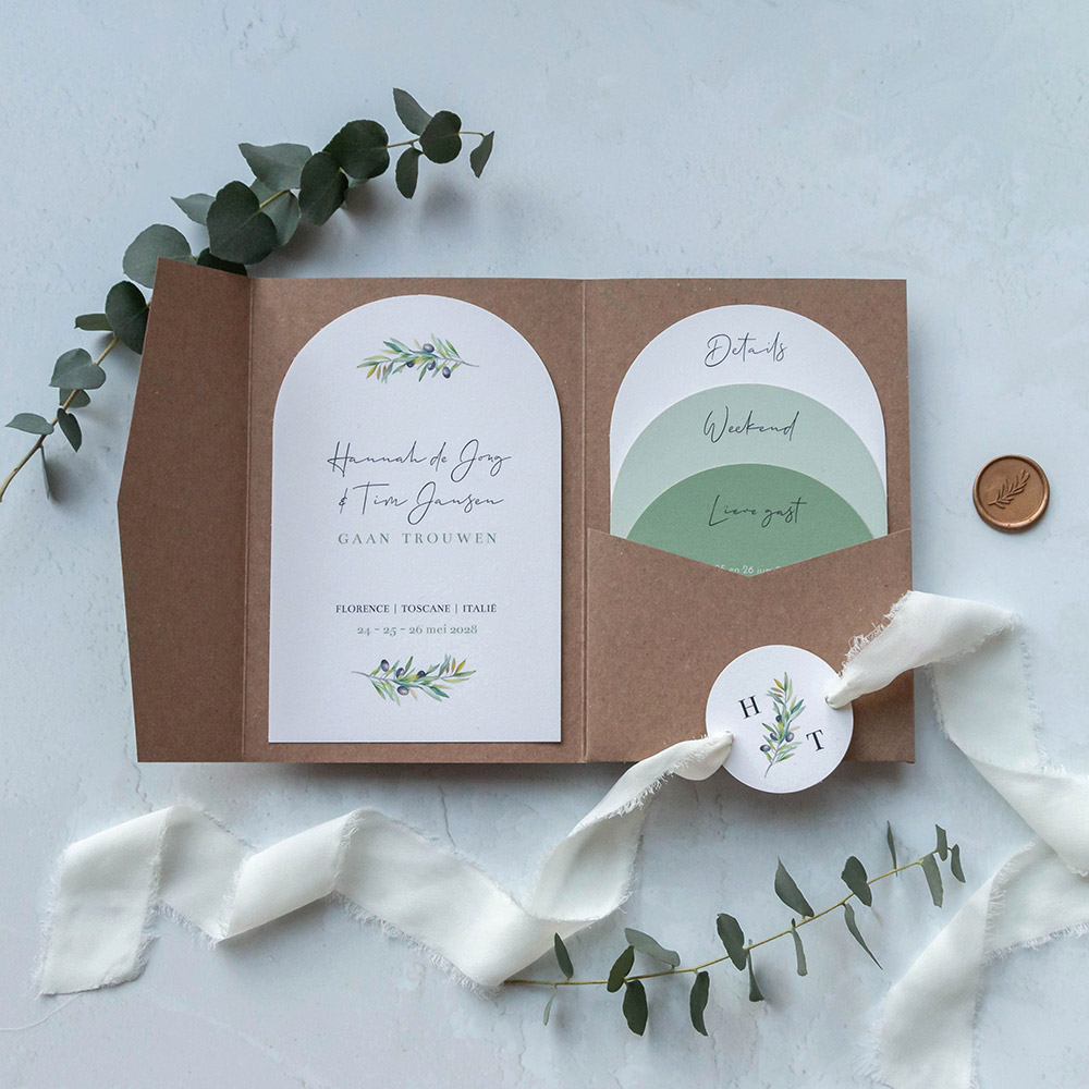 Trouwen jullie in het buitenland of heeft jullie bruiloft een mediteraans thema? Dan past deze pocketfold trouwkaart met boogvorm en olijftak er precies bij! Dit bestand voor de inlegkaartjes kun je zelf nog naar wens aanpassen. De pocketfold mapjes en accessoires bestel je er nog los bij. De linkerkaart plak je met een lijmstick in de kaart en de overige inlegkaartjes schuif je in het mapje. Formaten: 17x11 cm, 17x10,5 cm, 14x10,5 cm, 11x10,5 en 5,5x5,5 cm. Kleur mapje foto: Kraft