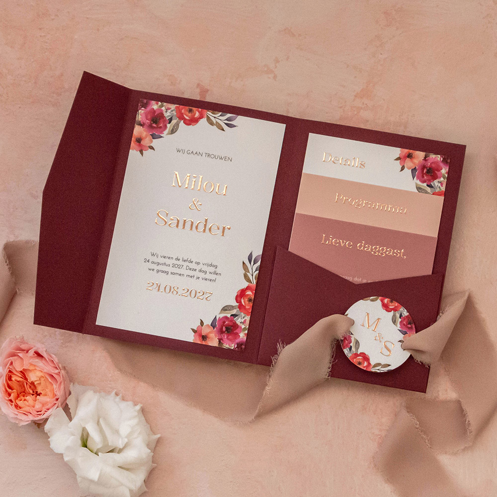 Romantische pocketfold trouwkaart met rode en roze watercolor bloemen en glimmende rosefolie. Dit bestand voor de inlegkaartjes kun je zelf nog naar wens aanpassen. De pocketfold mapjes en accessoires bestel je er nog los bij. De linkerkaart plak je met een lijmstick in de kaart en de overige inlegkaartjes schuif je in het mapje. Formaten: 17x11 cm, 17x10,5 cm, 14x10,5 cm, 11x10,5 en 5,5x5,5 cm. Kleur mapje foto: Berry Red