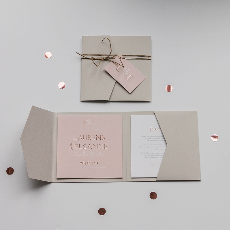 Deze romantische pocketfold trouwkaart is afgewerkt met rosefolie, een trouwlogo en is lichtroze. Het bestand voor de inlegkaartjes maak je zelf naar wens op. De pocketfold mapjes en accessoires bestel je er daarnaast nog los bij. Plak de linkerkaart met een lijmstick in de kaart. De overige inlegkaartjes schuif je eenvoudig in het mapje. De formaten zijn 13x13 cm, 13x13 cm, 11x13 cm, 9x13 cm en 7x4,5 cm.Kleur mapje foto: Cloud Grey