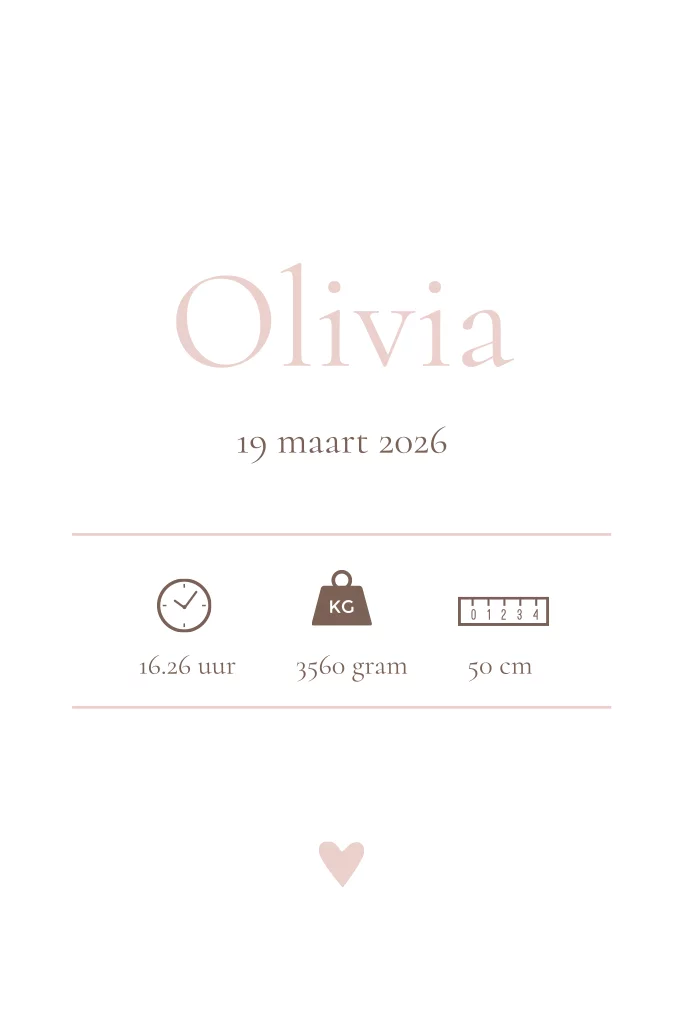 Ontwerp een mooie geboorteposter voor jullie dochter in de stijl van het geboortekaartje. Leuk voor op de babykamer om te bewaren als herinnering. Deze wit met roze poster heeft een formaat van 20x30 cm. Mooi om op te hangen in een lijstje.