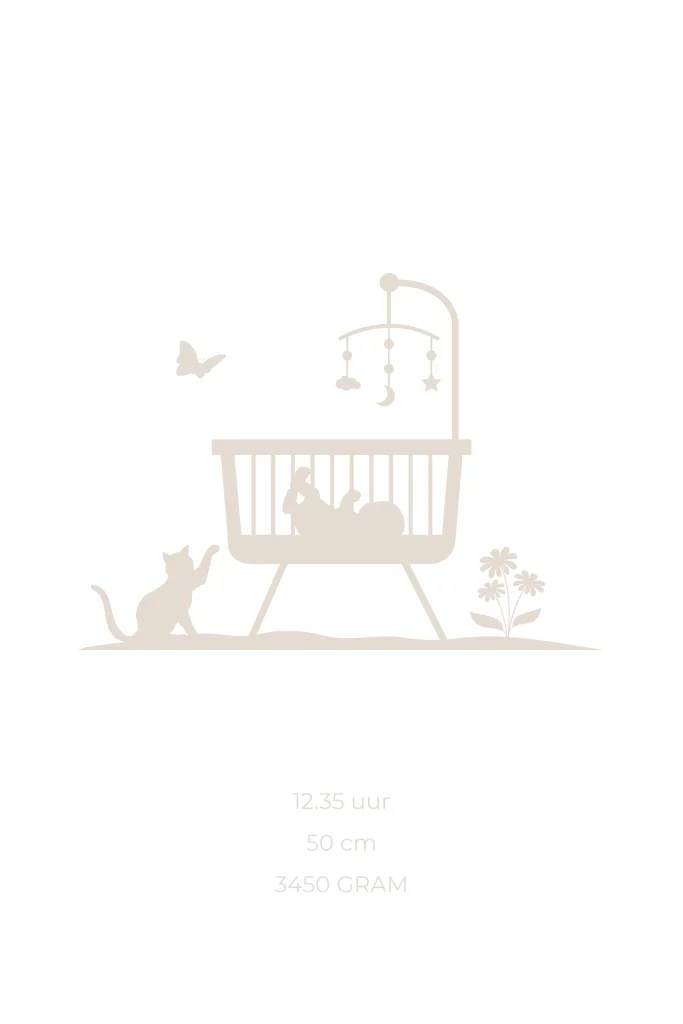 Ontwerp een mooie geboorteposter voor jullie kindje in de stijl van het geboortekaartje. Deze witte poster met silhouet van een wiegje goudfolie heeft een formaat van 20x30 cm. Leuk als decoratie voor op de babykamer.