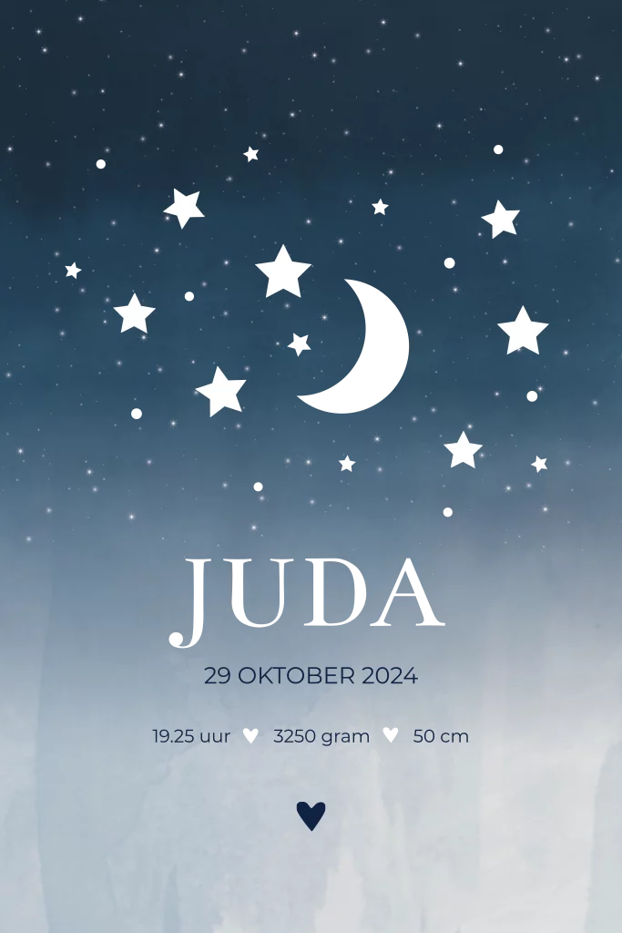 Geboorteposter jongen blauw met maan en sterren - Juda