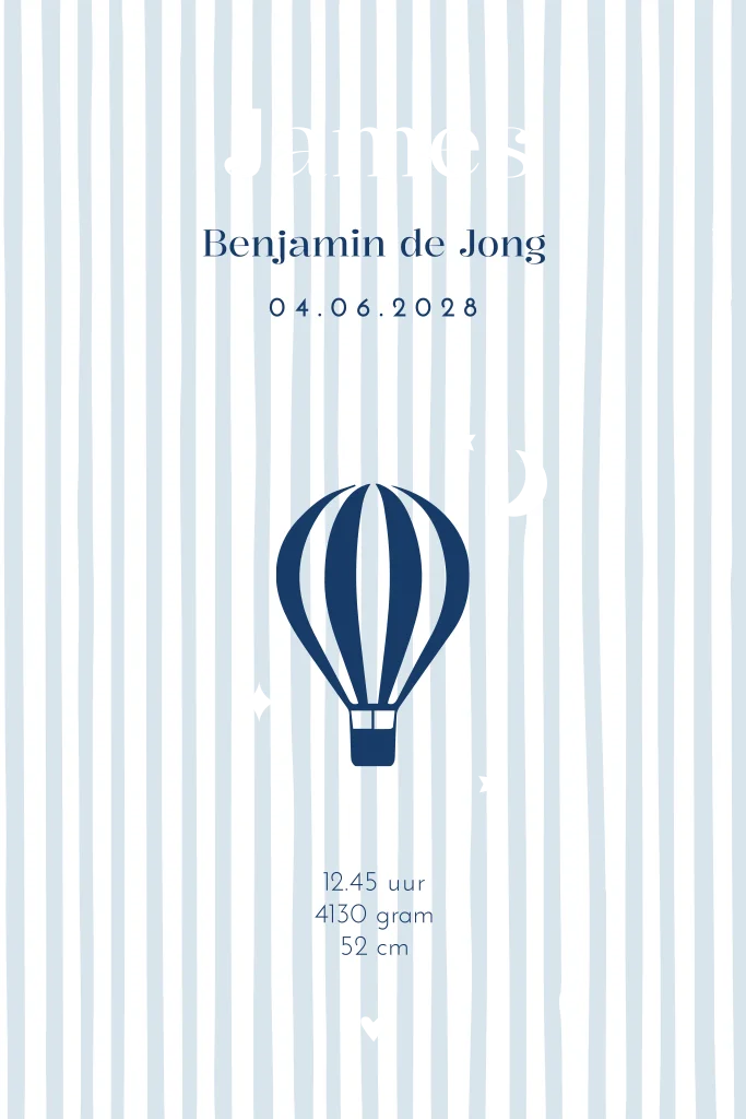 Ontwerp een mooie geboorteposter voor jullie zoon in de stijl van het geboortekaartje. Leuk voor op de babykamer om te bewaren als herinnering. Deze poster met luchtballon en goudfolie heeft een formaat van 20x30 cm. Mooi om op te hangen in een lijstje.