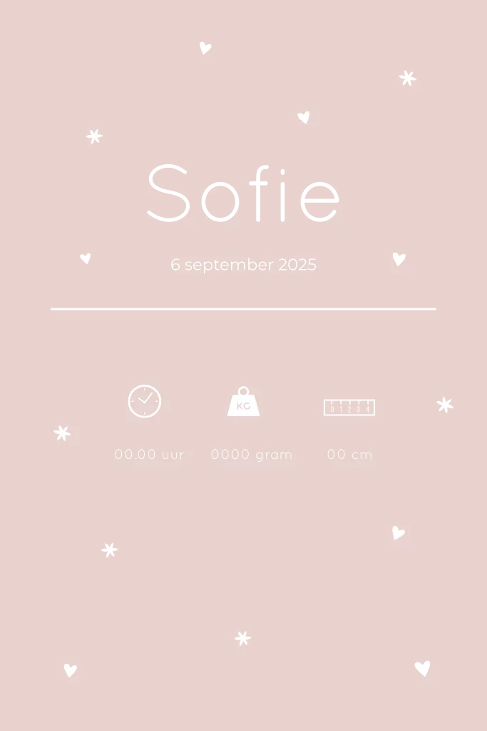 Ontwerp een mooie geboorteposter voor jullie dochter in de stijl van het geboortekaartje. Deze roze poster met hartjes en goudfolie heeft een formaat van 20x30 cm. Leuk als decoratie voor op de babykamer.