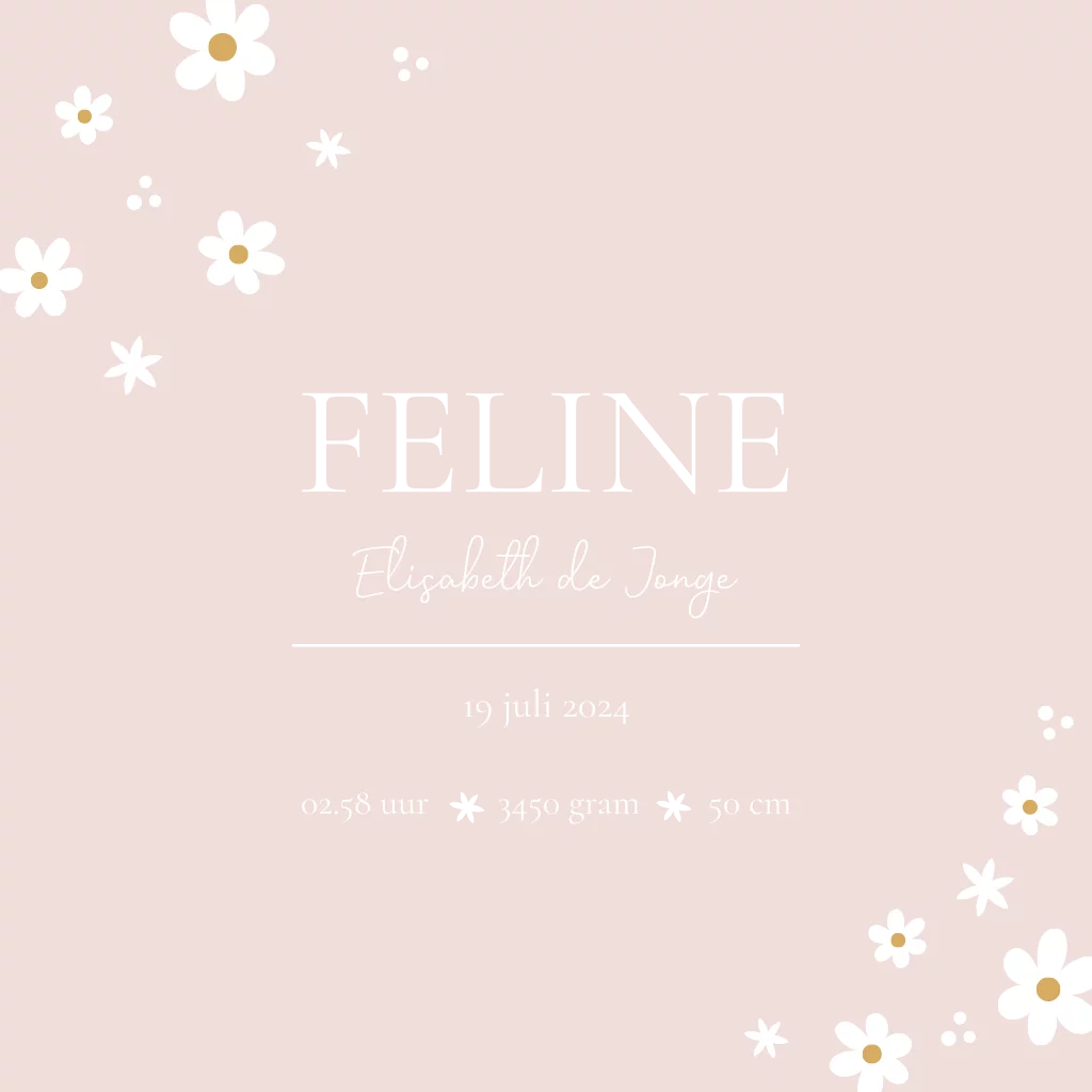 Ontwerp een mooie geboorteposter voor jullie dochter in de stijl van het geboortekaartje. Deze lichtroze poster met witte bloemetjes en goudfolie heeft een formaat van 30x30 cm. Leuk als decoratie voor op de babykamer.